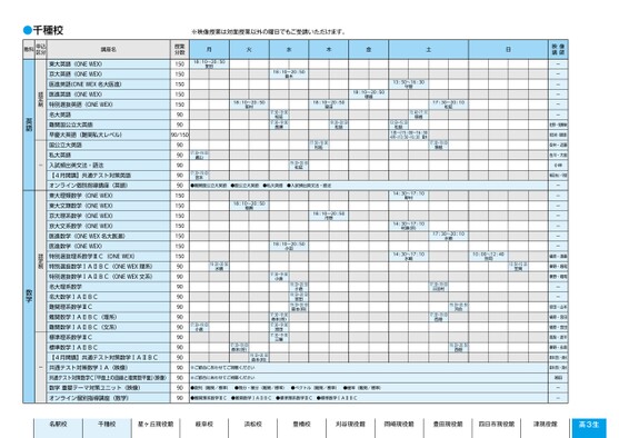 映像講師ーーーーーー佐野・胡摩﨑柴田(卓)・髙橋(慶)安井・近藤吉川・大島小林柴田(祐)・守屋ーーーーーーー樋原・須藤秦野・堀尾秦野・堀尾ーー依田・山本樋原・宮田樋原・宮田高梨・波平秦野・永島森本(啓)・清水森本(啓)・清水湘田ーー※映像授業は対面授業以外の曜日でもご受講いただけます。月火水木金土日18:10〜20:50室田18:10〜20:50登木18:10〜20:50笹村17:30〜19:0盧山17:30〜19:0宮本17:30〜19:0松延17:30〜19:0長瀬18:10〜20:50塚越18:10〜20:50室田19:20〜20:50松延17:30〜19:0松延19:20〜20:50松延●難関国公立大英語●国公立大英語●私大英語●入試頻出英文法・語法18:10〜20:50福眞18:10〜20:50市野18:10〜20:50小田19:20〜20:50小倉19:20〜20:50宮田19:20〜20:50森本(将)19:20〜20:50水嶋17:30〜19:0小倉17:30〜19:0森本(将)17:30〜19:0宮田17:30〜19:0三輪17:30〜19:0小倉17:30〜19:0森本(将)19:20〜20:50森本(将)※ご都合にあわせてご視聴ください※ご都合にあわせてご視聴ください●数列(難関/標準)●微分・積分(難関/標準)●ベクトル(難関/標準)●確率(難関/標準)●難関理系数学ⅢC●難関数学ⅠAⅡBC●標準理系数学ⅢC●標準数学ⅠAⅡBC13:50〜16:30守屋17:30〜20:10松延15:40〜17:10塚越:30登木17:30〜19:0塚越13:50〜15:0松延1月〜)15:00〜164月〜)13:50〜16:3014:30〜17:10野村14:30〜17:10村瀬(宗)17:30〜20:10水嶋14:30〜17:10水嶋10:00〜12:40笠岡13:50〜15:0笠岡17:30〜19:0三田村17:30〜19:0西畑19:20〜20:50河合19:20〜20:50西畑授業分数150150150150150909090/15090909090901501501501501501501509090909090909090909090909090東大英語(ONEWEX)京大英語(ONEWEX)医進英語(ONEWEX名大医進)医進英語(ONEWEX)特別選抜英語(ONEWEX)名大英語難関国公立大英語早慶大英語(難関私大レベル)国公立大英語私大英語入試頻出英文法・語法【4月開講】共通テスト対策英語オンライン個別指導講座(英語)東大理類数学(ONEWEX)東大文類数学(ONEWEX)京大理系数学(ONEWEX)京大文系数学(ONEWEX)医進数学(ONEWEX名大医進)医進数学(ONEWEX)特別選抜理系数学ⅢC(ONEWEX)特別選抜数学ⅠAⅡBC(ONEWEX理系)特別選抜数学ⅠAⅡBC(ONEWEX文系)名大理系数学名大数学ⅠAⅡBC難関理系数学ⅢC難関数学ⅠAⅡBC(理系)難関数学ⅠAⅡBC(文系)標準理系数学ⅢC標準数学ⅠAⅡBC【4月開講】共通テスト対策数学ⅠAⅡBC共通テスト対策数学ⅠA(映像)共通テスト対策数学C「平面上の曲線と複素数平面」映像)数学重要テーマ対策ユニット(映像)オンライン個別指導講座(数学)認定制-認定制-英語数学●千種校教科申込区分講座名名駅校千種校星ヶ丘現役館岐阜校浜松校豊橋校刈谷現役館岡崎現役館豊田現役館四日市現役館津現役館高3生