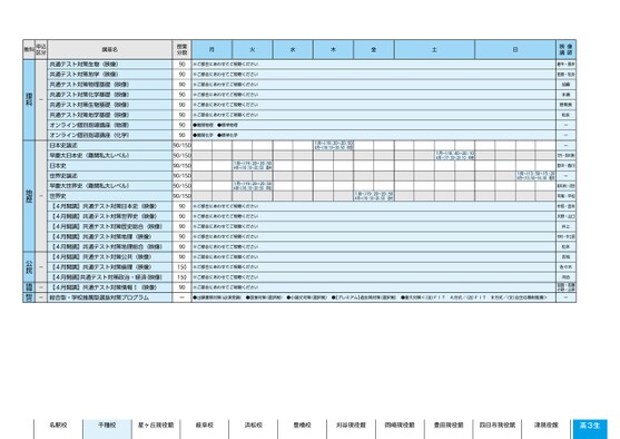 映像講師唐牛・長井田島・松永加藤本瀬野黒美松永ーーー大内・坂本(勝)田中・西川1月〜)13:50〜15:24月〜)13:50〜16:300堀井ー坂本(新)・沼田平尾・平松中垣・宮本大野・山口井上中村・中土居松本吉見佐々木河合加賀・佐藤小野・山家●出願書類対策(必須受講)●面接対策(選択制)●小論文対策(選択制)●【プレミアム】過去問対策(選択制)●慶大対策<(法)FITA方式/(法)FITB方式/(文)自主応募制推薦>ー名駅校千種校星ヶ丘現役館岐阜校浜松校豊橋校刈谷現役館岡崎現役館豊田現役館四日市現役館津現役館高3生月火水木金土日※ご都合にあわせてご視聴ください※ご都合にあわせてご視聴ください※ご都合にあわせてご視聴ください※ご都合にあわせてご視聴ください※ご都合にあわせてご視聴ください※ご都合にあわせてご視聴ください●難関物理●標準物理●難関化学●標準化学1月〜)19:20〜20:504月〜)18:10〜20:50酒井1月〜)19:20〜20:504月〜)18:10〜20:50平松※ご都合にあわせてご視聴ください※ご都合にあわせてご視聴ください※ご都合にあわせてご視聴ください※ご都合にあわせてご視聴ください※ご都合にあわせてご視聴ください※ご都合にあわせてご視聴ください※ご都合にあわせてご視聴ください※ご都合にあわせてご視聴ください※ご都合にあわせてご視聴ください1月〜)19:20〜20:504月〜)18:10〜20:50中垣1月〜)18:40〜20:14月〜)17:30〜20:100中垣1月〜)19:20〜20:504月〜)18:10〜20:50北村授業分数909090909090909090/15090/15090/15090/15090/15090/15090909090909015015090ー講座名共通テスト対策生物(映像)共通テスト対策地学(映像)共通テスト対策物理基礎(映像)共通テスト対策化学基礎(映像)共通テスト対策生物基礎(映像)共通テスト対策地学基礎(映像)オンライン個別指導講座(物理)オンライン個別指導講座(化学)日本史論述早慶大日本史(難関私大レベル)日本史世界史論述早慶大世界史(難関私大レベル)世界史【4月開講】共通テスト対策日本史(映像)【4月開講】共通テスト対策世界史(映像)【4月開講】共通テスト対策歴史総合(映像)【4月開講】共通テスト対策地理(映像)【4月開講】共通テスト対策地理総合(映像)【4月開講】共通テスト対策公共(映像)【4月開講】共通テスト対策倫理(映像)【4月開講】共通テスト対策政治・経済(映像)【4月開講】共通テスト対策情報Ⅰ(映像)総合型・学校推薦型選抜対策プログラム教科申込区分-理科-地歴---公民情報総合