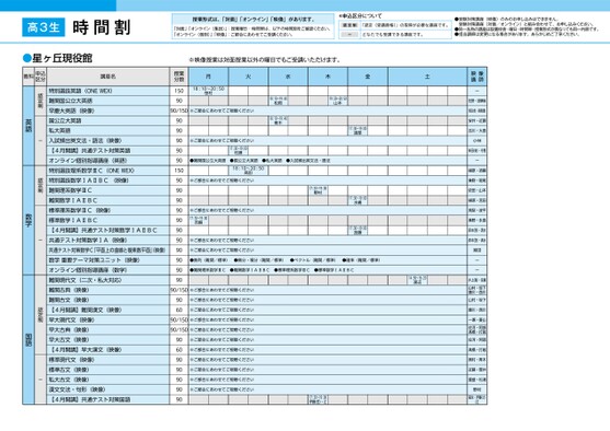 授業形式は、「対面」「オンライン」「映像」があります。「対面」「オンライン(集団)」:授業曜日・時間帯は、以下の時間割をご確認ください。「オンライン(個別)」「映像」:ご都合にあわせてご受講ください。*申込区分について認定制「認定(受講資格)」の取得が必要な講座です。ーどなたでも受講できる講座です。●受験対策講座(映像)のみのお申し込みはできません。受験対策講座(対面/オンライン)と組み合わせて、お申し込みください。●同一名称の講座は設置校舎・曜日・時間帯・授業形式が異なっても同一内容です。●担当講師は変更になる場合があります。あらかじめご了承ください。※映像授業は対面授業以外の曜日でもご受講いただけます。月火水木金土18:10〜20:50笹村90/150※ご都合にあわせてご視聴ください19:20〜20:50山本18:0〜19:40松岡18:0〜19:40青木※ご都合にあわせてご視聴ください17:30〜19:00村瀬語英大立公国関難●語英大立公国●語英大私●法語・法文英出頻試入●18:10〜20:50高田※ご都合にあわせてご視聴ください17:30〜19:00野村※ご都合にあわせてご視聴ください17:0〜19:00吉嗣※ご都合にあわせてご視聴ください※ご都合にあわせてご視聴ください17:30〜19:0渡部17:30〜19:0水嶋17:30〜19:0加藤)準標/関難(列数●)準標/関難(分積・分微●)準標/関難(ルトクベ●)準標/関難(率確●CⅢ学数系理関難●CBⅡAⅠ学数関難●CⅢ学数系理準標●CBⅡAⅠ学数準標●14:50〜16:20渡辺90/150※ご都合にあわせてご視聴ください9060※ご都合にあわせてご視聴ください※ご都合にあわせてご視聴ください90/150※ご都合にあわせてご視聴ください90/150※ご都合にあわせてご視聴ください※ご都合にあわせてご視聴ください※ご都合にあわせてご視聴ください※ご都合にあわせてご視聴ください※ご都合にあわせてご視聴ください※ご都合にあわせてご視聴ください※ご都合にあわせてご視聴ください9060909090909017:30〜19:00伊藤(哲)・江映像講師ー佐野・胡摩﨑柴田()・髙橋(慶)安井・近藤吉川・大島小林柴田(祐)・守屋ー樋原・須藤秦野・堀尾依田・山本樋原・宮田高梨・波平秦野・永島森本(啓)・清水森本(啓)・清水湘田ーー井上(真)・佐藤山村・坂下藤川・西川山村・坂下藤川・西川一瀬・菱山佐河・阿部髙橋・打越佐河・阿部髙橋・打越奥村・青木近藤・菅井重盛・松浦野村福永・伊藤(さ)江授業分数1509090909090901509090909090909090909090特別選抜英語(ONEWEX)難関国公立大英語早慶大英語(映像)国公立大英語私大英語入試頻出英文法・語法(映像)【4月開講】共通テスト対策英語オンライン個別指導講座(英語)特別選抜理系数学ⅢC(ONEWEX)特別選抜数学ⅠAⅡBC(映像)難関理系数学ⅢC難関数学ⅠAⅡBC標準理系数学ⅢC(映像)標準数学ⅠAⅡBC【4月開講】共通テスト対策数学ⅠAⅡBC共通テスト対策数学ⅠA(映像)共通テスト対策数学C「平面上の曲線と複素数平面」映像)数学重要テーマ対策ユニット(映像)オンライン個別指導講座(数学)難関現代文(二次・私大対応)難関古典(映像)難関古文(映像)【4月開講】難関漢文(映像)早大現代文(映像)早大古典(映像)早大古文(映像)【4月開講】早大漢文(映像)標準現代文(映像)標準古文(映像)私大古文(映像)漢文文法・句形(映像)【4月開講】共通テスト対策国語認定制-認定制-認定制-英語数学国語高3生時間割●星ヶ丘現役館教科申込区分講座名