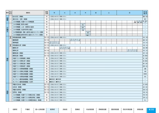 映像講師重盛・松浦野村福永・伊藤(さ)江ーーーーー木村・小野渡部・坂本佐々木・木村大髙・小松寺田・青野中村・小松向井・三浦牧島・西尾(健)乾・大學安達・西尾(源)唐牛・長井田島・松永加藤本瀬野黒美松永ーー大内・坂本(勝)田中・西川坂本(新)・沼田平尾・平松中垣・宮本大野・山口井上月火水木金土日※ご都合にあわせてご視聴ください※ご都合にあわせてご視聴ください17:20〜18:50早川17:20〜18:50鈴木17:20〜18:50日髙19:10〜20:40宮元19:10〜20:40伊藤(し)16:40〜18:10齊藤・笹森・野村1月〜)14:30〜16:04月〜)13:20〜16:000太田90/150※ご都合にあわせてご視聴ください90/15090/1501月〜)19:40〜21:104月〜)18:30〜21:10小山90/150※ご都合にあわせてご視聴ください90/15090/1501月〜)19:40〜21:104月〜)18:30〜21:10若原1月〜)19:40〜214月〜)18:30〜21:10:10坂本90/150※ご都合にあわせてご視聴ください90/150※ご都合にあわせてご視聴ください90909090909090909090※ご都合にあわせてご視聴ください※ご都合にあわせてご視聴ください※ご都合にあわせてご視聴ください※ご都合にあわせてご視聴ください※ご都合にあわせてご視聴ください※ご都合にあわせてご視聴ください※ご都合にあわせてご視聴ください※ご都合にあわせてご視聴ください●難関物理●標準物理●難関化学●標準化学90/150※ご都合にあわせてご視聴ください90/150※ご都合にあわせてご視聴ください90/150※ご都合にあわせてご視聴ください90/150※ご都合にあわせてご視聴ください909090※ご都合にあわせてご視聴ください※ご都合にあわせてご視聴ください※ご都合にあわせてご視聴ください授業分数9090909090909090私大古文(映像)漢文文法・句形(映像)【4月開講】共通テスト対策国語【4月開講】医系小論文【4月開講】人文・教育系小論文【4月開講】社会科学系小論文【4月開講】看護・保健・歯学系小論文(オンライン授業)【4月開講】自然科学系小論文(オンライン授業)特別選抜物理(映像)難関物理標準物理特別選抜化学(映像)難関化学標準化学難関生物(映像)標準生物(映像)共通テスト対策物理(映像)共通テスト対策化学(映像)共通テスト対策生物(映像)共通テスト対策地学(映像)共通テスト対策物理基礎(映像)共通テスト対策化学基礎(映像)共通テスト対策生物基礎(映像)共通テスト対策地学基礎(映像)オンライン個別指導講座(物理)オンライン個別指導講座(化学)早慶大日本史(映像)日本史(映像)早慶大世界史(映像)世界史(映像)【4月開講】共通テスト対策日本史(映像)【4月開講】共通テスト対策世界史(映像)【4月開講】共通テスト対策歴史総合(映像)--認定制-認定制-国語小論文理科-地歴教科申込区分講座名名駅校千種校星ヶ丘現役館岐阜校浜松校豊橋校刈谷現役館岡崎現役館豊田現役館四日市現役館津現役館高3生