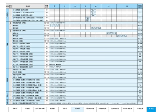 授業分数9090909090月火水木金土日17:20〜18:0大田17:20〜18:0鈴木17:20〜18:0日髙19:10〜20:40宮元19:10〜20:40伊藤(し)1月〜)19:50〜21:204月〜)18:40〜21:20荒木1月〜)19:50〜21:204月〜)18:40〜21:20齋藤1月〜)14:40〜16:104月〜)13:30〜16:10中村90/150※ご都合にあわせてご視聴ください1月〜)19:50〜21:204月〜)18:40〜21:20岸90/15090/15090/150※ご都合にあわせてご視聴ください90/15090/15090/150※ご都合にあわせてご視聴ください90/150※ご都合にあわせてご視聴ください90909090909090909090※ご都合にあわせてご視聴ください※ご都合にあわせてご視聴ください※ご都合にあわせてご視聴ください※ご都合にあわせてご視聴ください※ご都合にあわせてご視聴ください※ご都合にあわせてご視聴ください※ご都合にあわせてご視聴ください※ご都合にあわせてご視聴ください●難関物理●標準物理●難関化学●標準化学90/150※ご都合にあわせてご視聴ください90/150※ご都合にあわせてご視聴ください90/150※ご都合にあわせてご視聴ください90/150※ご都合にあわせてご視聴ください※ご都合にあわせてご視聴ください※ご都合にあわせてご視聴ください※ご都合にあわせてご視聴ください※ご都合にあわせてご視聴ください※ご都合にあわせてご視聴ください※ご都合にあわせてご視聴ください※ご都合にあわせてご視聴ください※ご都合にあわせてご視聴ください※ご都合にあわせてご視聴ください90909090909015015090ー名駅校千種校星ヶ丘現役館岐阜校浜松校豊橋校刈谷現役館岡崎現役館豊田現役館四日市現役館津現役館高3生●出願書類対策(必須受講)●面接対策(選択制)●小論文対策(選択制)●【プレミアム】過去問対策(選択制)●慶大対策<(法)FITA方式/(法)FITB方式/(文)自主応募制推薦>ー映像講師ーーーーー木村・小野渡部・坂本佐々木・木村大髙・小松寺田・青野中村・小松向井・三浦牧島・西尾(健)乾・大學安達・西尾(源)唐牛・長井田島・松永加藤本瀬野黒美松永ーー大内・坂本(勝)田中・西川坂本(新)・沼田平尾・平松中垣・宮本大野・山口井上中村・中土居松本吉見佐々木河合加賀・佐藤小野・山家【4月開講】医系小論文【4月開講】人文・教育系小論文【4月開講】社会科学系小論文【4月開講】看護・保健・歯学系小論文(オンライン授業)【4月開講】自然科学系小論文(オンライン授業)特別選抜物理(映像)難関物理標準物理特別選抜化学(映像)難関化学標準化学難関生物(映像)標準生物(映像)共通テスト対策物理(映像)共通テスト対策化学(映像)共通テスト対策生物(映像)共通テスト対策地学(映像)共通テスト対策物理基礎(映像)共通テスト対策化学基礎(映像)共通テスト対策生物基礎(映像)共通テスト対策地学基礎(映像)オンライン個別指導講座(物理)オンライン個別指導講座(化学)早慶大日本史(映像)日本史(映像)早慶大世界史(映像)世界史(映像)【4月開講】共通テスト対策日本史(映像)【4月開講】共通テスト対策世界史(映像)【4月開講】共通テスト対策歴史総合(映像)【4月開講】共通テスト対策地理(映像)【4月開講】共通テスト対策地理総合(映像)【4月開講】共通テスト対策公共(映像)【4月開講】共通テスト対策倫理(映像)【4月開講】共通テスト対策政治・経済(映像)【4月開講】共通テスト対策情報Ⅰ(映像)総合型・学校推薦型選抜対策プログラム-認定制-認定制-小論文理科-地歴---公民情報総合教科申込区分講座名