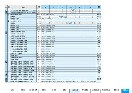 授業分数9090月火水木金土19:10〜20:40宮元19:10〜20:40伊藤(し)1月〜)20:00〜214月〜)18:50〜21:30:30宮地1月〜)20:00〜21:304月〜)18:50〜21:30花田90/150※ご都合にあわせてご視聴ください90/15090/150※ご都合にあわせてご視聴ください90/150※ご都合にあわせてご視聴ください90/15090/150※ご都合にあわせてご視聴ください90/150※ご都合にあわせてご視聴ください90/150※ご都合にあわせてご視聴ください90909090909090909090※ご都合にあわせてご視聴ください※ご都合にあわせてご視聴ください※ご都合にあわせてご視聴ください※ご都合にあわせてご視聴ください※ご都合にあわせてご視聴ください※ご都合にあわせてご視聴ください※ご都合にあわせてご視聴ください※ご都合にあわせてご視聴ください●難関物理●標準物理●難関化学●標準化学90/150※ご都合にあわせてご視聴ください90/150※ご都合にあわせてご視聴ください90/150※ご都合にあわせてご視聴ください90/150※ご都合にあわせてご視聴ください※ご都合にあわせてご視聴ください※ご都合にあわせてご視聴ください※ご都合にあわせてご視聴ください※ご都合にあわせてご視聴ください※ご都合にあわせてご視聴ください※ご都合にあわせてご視聴ください※ご都合にあわせてご視聴ください※ご都合にあわせてご視聴ください※ご都合にあわせてご視聴ください90909090909015015090ー●出願書類対策(必須受講)●面接対策(選択制)●小論文対策(選択制)●【プレミアム】過去問対策(選択制)●慶大対策<(法)FITA方式/(法)FITB方式/(文)自主応募制推薦>ー名駅校千種校星ヶ丘現役館岐阜校浜松校豊橋校刈谷現役館岡崎現役館豊田現役館四日市現役館津現役館高3生映像講師ーー木村・小野渡部・坂本佐々木・木村大髙・小松寺田・青野中村・小松向井・三浦牧島・西尾(健)乾・大學安達・西尾(源)唐牛・長井田島・松永加藤本瀬野黒美松永ーー大内・坂本(勝)田中・西川坂本(新)・沼田平尾・平松中垣・宮本大野・山口井上中村・中土居松本吉見佐々木河合加賀・佐藤小野・山家【4月開講】看護・保健・歯学系小論文(オンライン授業)【4月開講】自然科学系小論文(オンライン授業)特別選抜物理(映像)難関物理標準物理(映像)特別選抜化学(映像)難関化学標準化学(映像)難関生物(映像)標準生物(映像)共通テスト対策物理(映像)共通テスト対策化学(映像)共通テスト対策生物(映像)共通テスト対策地学(映像)共通テスト対策物理基礎(映像)共通テスト対策化学基礎(映像)共通テスト対策生物基礎(映像)共通テスト対策地学基礎(映像)オンライン個別指導講座(物理)オンライン個別指導講座(化学)早慶大日本史(映像)日本史(映像)早慶大世界史(映像)世界史(映像)【4月開講】共通テスト対策日本史(映像)【4月開講】共通テスト対策世界史(映像)【4月開講】共通テスト対策歴史総合(映像)【4月開講】共通テスト対策地理(映像)【4月開講】共通テスト対策地理総合(映像)【4月開講】共通テスト対策公共(映像)【4月開講】共通テスト対策倫理(映像)【4月開講】共通テスト対策政治・経済(映像)【4月開講】共通テスト対策情報Ⅰ(映像)総合型・学校推薦型選抜対策プログラム-認定制-認定制-小論文理科-地歴---公民情報総合教科申込区分講座名
