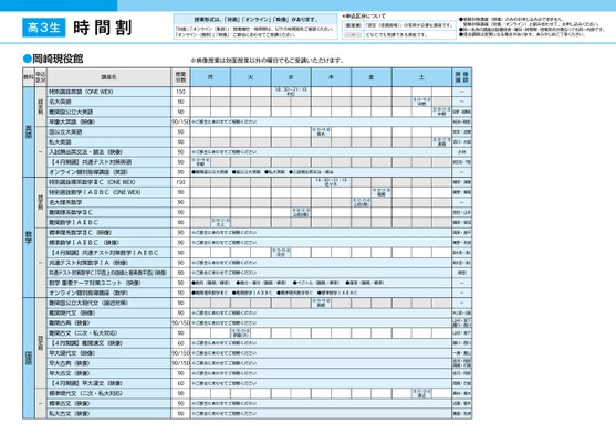 授業形式は、「対面」「オンライン」「映像」があります。「対面」「オンライン(集団)」:授業曜日・時間帯は、以下の時間割をご確認ください。「オンライン(個別)」「映像」:ご都合にあわせてご受講ください。*申込区分について認定制「認定(受講資格)」の取得が必要な講座です。ーどなたでも受講できる講座です。●受験対策講座(映像)のみのお申し込みはできません。受験対策講座(対面/オンライン)と組み合わせて、お申し込みください。●同一名称の講座は設置校舎・曜日・時間帯・授業形式が異なっても同一内容です。●担当講師は変更になる場合があります。あらかじめご了承ください。※映像授業は対面授業以外の曜日でもご受講いただけます。月火水木金18:30〜21:10市位授業分数150909090/150※ご都合にあわせてご視聴ください90909090901509090909090909090909090909018:10〜19:40青木※ご都合にあわせてご視聴ください18:10〜19:40宇野語英大立公国関難●語英大立公国●語英大私●法語・法文英出頻試入●18:30〜21:10佐々木19:0〜21:0福眞18:10〜19:0山田(龍)19:0〜21:00山田(龍)20:00〜21:30大上※ご都合にあわせてご視聴ください※ご都合にあわせてご視聴ください※ご都合にあわせてご視聴ください※ご都合にあわせてご視聴ください18:0〜19:40河合)準標/関難(列数●)準標/関難(分積・分微●)準標/関難(ルトクベ●)準標/関難(率確●CⅢ学数系理関難●CBⅡAⅠ学数関難●CⅢ学数系理準標●CBⅡAⅠ学数準標●※ご都合にあわせてご視聴ください18:10〜19:40高橋90/150※ご都合にあわせてご視聴ください906018:30〜20:00伊藤(さ)※ご都合にあわせてご視聴ください90/150※ご都合にあわせてご視聴ください90/150※ご都合にあわせてご視聴ください9060909090※ご都合にあわせてご視聴ください※ご都合にあわせてご視聴ください※ご都合にあわせてご視聴ください※ご都合にあわせてご視聴ください土18:10〜19:40中野20:00〜21:30中野20:00〜21:30渡邉18:10〜19:40渡辺映像講師ーー佐野・胡摩﨑柴田(卓)・髙橋(慶)安井・近藤吉川・大島小林柴田(祐)・守屋ー樋原・須藤秦野・堀尾ー依田・山本樋原・宮田高梨・波平秦野・永島森本(啓)・清水森本(啓)・清水湘田ーーー井上(真)・佐藤山村・坂下藤川・西川山村・坂下藤川・西川一瀬・菱山佐河・阿部髙橋・打越佐河・阿部髙橋・打越奥村・青木近藤・菅井重盛・松浦特別選抜英語(ONEWEX)名大英語難関国公立大英語早慶大英語(映像)国公立大英語私大英語入試頻出英文法・語法(映像)【4月開講】共通テスト対策英語オンライン個別指導講座(英語)特別選抜理系数学ⅢC(ONEWEX)特別選抜数学ⅠAⅡBC(ONEWEX)名大理系数学難関理系数学ⅢC難関数学ⅠAⅡBC標準理系数学ⅢC(映像)標準数学ⅠAⅡBC(映像)【4月開講】共通テスト対策数学ⅠAⅡBC共通テスト対策数学ⅠA(映像)共通テスト対策数学C「平面上の曲線と複素数平面」映像)数学重要テーマ対策ユニット(映像)オンライン個別指導講座(数学)難関国公立大現代文(論述対策)難関現代文(映像)難関古典(映像)難関古文(二次・私大対応)【4月開講】難関漢文(映像)早大現代文(映像)早大古典(映像)早大古文(映像)【4月開講】早大漢文(映像)標準現代文(二次・私大対応)標準古文(映像)私大古文(映像)認定制-認定制-認定制-英語数学国語高3生時間割●岡崎現役館教科申込区分講座名