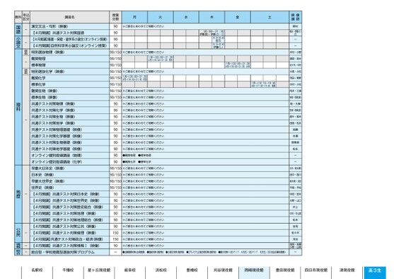 授業分数90909090月火水木金土※ご都合にあわせてご視聴ください20:00〜21:30伊藤(哲)・伊藤(さ)・江19:10〜20:40宮元19:10〜20:40伊藤(し)1月〜)20:00〜21:304月〜)18:50〜21:30小林1月〜)18:10〜19:404月〜)17:00〜19:40若原90/150※ご都合にあわせてご視聴ください90/15090/1501月〜)20:00〜21:304月〜)18:50〜21:30荒木90/150※ご都合にあわせてご視聴ください1月〜)20:00〜21:304月〜)18:50〜21:30花田90/15090/15090/150※ご都合にあわせてご視聴ください90/150※ご都合にあわせてご視聴ください90909090909090909090※ご都合にあわせてご視聴ください※ご都合にあわせてご視聴ください※ご都合にあわせてご視聴ください※ご都合にあわせてご視聴ください※ご都合にあわせてご視聴ください※ご都合にあわせてご視聴ください※ご都合にあわせてご視聴ください※ご都合にあわせてご視聴ください●難関物理●標準物理●難関化学●標準化学90/150※ご都合にあわせてご視聴ください90/150※ご都合にあわせてご視聴ください90/150※ご都合にあわせてご視聴ください90/150※ご都合にあわせてご視聴ください※ご都合にあわせてご視聴ください※ご都合にあわせてご視聴ください※ご都合にあわせてご視聴ください※ご都合にあわせてご視聴ください※ご都合にあわせてご視聴ください※ご都合にあわせてご視聴ください※ご都合にあわせてご視聴ください※ご都合にあわせてご視聴ください※ご都合にあわせてご視聴ください90909090909015015090ー●出願書類対策(必須受講)●面接対策(選択制)●小論文対策(選択制)●【プレミアム】過去問対策(選択制)●慶大対策<(法)FITA方式/(法)FITB方式/(文)自主応募制推薦>ー名駅校千種校星ヶ丘現役館岐阜校浜松校豊橋校刈谷現役館岡崎現役館豊田現役館四日市現役館津現役館高3生映像講師野村福永・伊藤(さ)江ーー木村・小野渡部・坂本佐々木・木村大髙・小松寺田・青野中村・小松向井・三浦牧島・西尾(健)乾・大學安達・西尾(源)唐牛・長井田島・松永加藤本瀬野黒美松永ーー大内・坂本(勝)田中・西川坂本(新)・沼田平尾・平松中垣・宮本大野・山口井上中村・中土居松本吉見佐々木河合加賀・佐藤小野・山家漢文文法・句形(映像)【4月開講】共通テスト対策国語【4月開講】看護・保健・歯学系小論文(オンライン授業)【4月開講】自然科学系小論文(オンライン授業)特別選抜物理(映像)難関物理標準物理特別選抜化学(映像)難関化学標準化学難関生物(映像)標準生物(映像)共通テスト対策物理(映像)共通テスト対策化学(映像)共通テスト対策生物(映像)共通テスト対策地学(映像)共通テスト対策物理基礎(映像)共通テスト対策化学基礎(映像)共通テスト対策生物基礎(映像)共通テスト対策地学基礎(映像)オンライン個別指導講座(物理)オンライン個別指導講座(化学)早慶大日本史(映像)日本史(映像)早慶大世界史(映像)世界史(映像)【4月開講】共通テスト対策日本史(映像)【4月開講】共通テスト対策世界史(映像)【4月開講】共通テスト対策歴史総合(映像)【4月開講】共通テスト対策地理(映像)【4月開講】共通テスト対策地理総合(映像)【4月開講】共通テスト対策公共(映像)【4月開講】共通テスト対策倫理(映像)【4月開講】共通テスト対策政治・経済(映像)【4月開講】共通テスト対策情報Ⅰ(映像)総合型・学校推薦型選抜対策プログラム--認定制-認定制-国語小論文理科-地歴---公民情報総合教科申込区分講座名