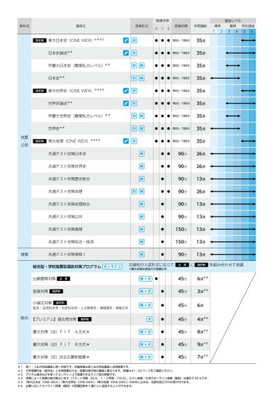 教科名講座名認定制東大日本史(ONEWEX)※4※5日本史論述※4早慶大日本史(難関私大レベル)※4日本史※4認定制東大世界史(ONEWEX)※4※5世界史論述※4早慶大世界史(難関私大レベル)※4世界史※4地歴公民・認定制東大地理(ONEWEX)※4※5共通テスト対策日本史共通テスト対策世界史共通テスト対策歴史総合共通テスト対策地理共通テスト対策地理総合共通テスト対策公共共通テスト対策倫理共通テスト対策政治・経済情報共通テスト対策情報Ⅰ授業形式開講学期ス12授業時間年間講数標準難関1234特別選抜56講座レベル●●●90分/150分●●●90分/150分●●●90分/150分●●●90分/150分●●●90分/150分●●●90分/150分●●●90分/150分●●●90分/150分●●●90分/150分●●●●●●●●●●●●90分90分90分90分90分90分150分150分90分35講35講35講35講35講35講35講35講35講26講26講13講26講13講13講13講13講13講総合型・学校推薦型選抜対策プログラムオンライン志望校の入試形式に応じて必須に選択制を組み合わせて受講*慶大対策は単独での受講も可出願書類対策必須面接対策選択制小論文対策医系・自然科学系・社会科学系・人文教育系・情報理系・情報文系選択制総合【プレミアム】過去問対策選択制慶大対策(法)FITA方式*慶大対策(法)FITB方式*慶大対策(文)自主応募制推薦*●●●●●●●45分45分45分45分45分45分45分6講※63講※66講4講※68講※69講※67講※6※1高1・2生の同名講座と同一内容です。対面授業は高2生の同名講座と合同授業です。※2大学受験科生(高卒生)と合同授業のため、授業日程が他の講座と異なります。詳細は61・62ページをご確認ください。※3デジタル端末などを使ってオンライン上で受講できるライブ型の授業です。※4学期によって授業分数が異なります(スタート学期:90分、1・2学期:150分)。ただし物理・化学のオンライン授業(個別)は通年で90分です。※5「東大日本史(ONEWEX)」「東大世界史(ONEWEX)」「東大地理(ONEWEX)」のお申し込みは、名駅校窓口でのみ受け付けます。※6必要に応じてオンライン授業(個別)の受講回数を1講ごとに追加することができます。