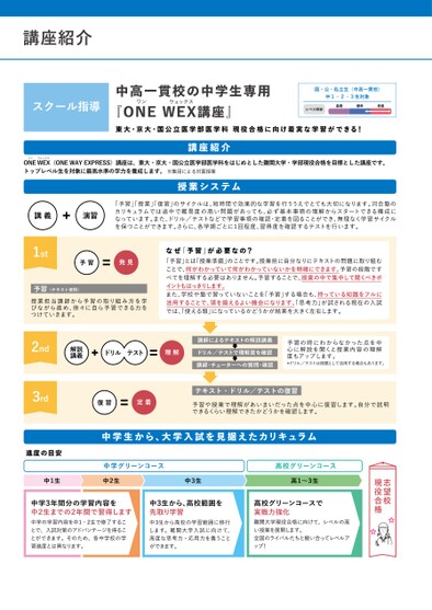 講座紹介スクール指導中高一貫校の中学生専用ワンウェックス『ONEWEX講座』国・公・私立生(中高一貫校)中1・2・3生対象レベル目安基礎標準発展東大・京大・国公立医学部医学科現役合格に向け着実な学習ができる!講座紹介ワンウェックスONEWEX(ONEWAYEXPRESS)講座は、東大・京大・国公立医学部医学科をはじめとした難関大学・学部現役合格を目標とした講座です。トップレベル生を対象に最高水準の学力を養成します。※集団による対面授業授業システム講義演習「予習」「授業」「復習」のサイクルは、短時間で効果的な学習を行ううえでとても大切になります。河合塾のカリキュラムでは途中で難易度の高い問題があっても、必ず基本事項の理解からスタートできる構成になっています。また、ドリル/テストなどで学習事項の確認・定着を図ることができ、無理なく学習サイクルを保つことができます。さらに、各学期ごとに1回程度、習得度を確認するテストを行います。1st予習発見予習(テキスト使用)授業担当講師から予習の取り組み方を学びながら進め、徐々に自ら予習できる力をつけていきます。なぜ「予習」が必要なの?「予習」とは「授業準備」のことです。授業前に自分なりにテキストの問題に取り組むことで、何がわかっていて何がわかっていないかを明確にできます。予習の段階ですべてを理解する必要はありません。予習することで、授業の中で集中して聞くべきポイントもはっきりします。また、学校や塾で習っていないことを「予習」する場合も、持っている知識をフルに活用することで、頭を鍛えるよい機会になります。思考力」が試される現在の入試では、「使える頭」になっているかどうかが結果を大きく左右します。2nd解説講義ドリルテスト理解ドリル/テストで理解度を確認講師によるテキストの解説講義講師・チューターへの質問・確認予習の時にわからなかった点を中心に解説を聞くと授業内容の理解度もアップします。*ドリル/テストは宿題として活用する場合もあります。3rd復習定着テキスト・ドリル/テストの復習予習や授業で理解があいまいだった点を中心に復習します。自分で説明できるくらい理解できたかどうかを確認します。校望志格合役現中学生から、大学入試を見据えたカリキュラム進度の目安中学グリーンコース中1生中2生中3生高校グリーンコース高1〜3生中学3年間分の学習内容を中2生までの2年間で習得します中学の学習内容を中1・2生で修了することで、入試対策のアドバンテージを得ることができます。そのため、各中学校の学習進度とは異なります。中3生から、高校範囲を先取り学習中3生から高校の学習範囲に移行します。難関大学入試に向けて、高度な思考力・応用力を養うことができます。高校グリーンコースで実戦力強化難関大学現役合格に向けて、レベルの高い授業を展開します。全国のライバルたちと競い合ってレベルアップ!
