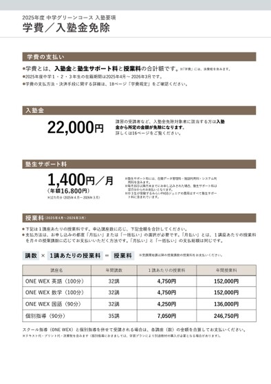 2025年度中学グリーンコース入塾要項学費/入塾金免除学費の支払い●学費とは、入塾金と塾生サポート料と授業料の合計額です。※「学費」には、消費税を含みます。●2025年度中学1・2・3年生の在籍期間は2025年4月〜2026年3月です。●学費の支払方法・決済手段に関する詳細は、18ページ「学費規定」をご確認ください。入塾金22,000円講習の受講者など、入塾金免除対象者に該当する方は入塾金から所定の金額が免除になります。詳しくは16ページをご覧ください。塾生サポート料1,400円/月(年額16,800円)※12カ月分(2025年4月〜2026年3月)授業料(2025年4月〜2026年3月)※塾生サポート料には、在籍データ管理料・施設利用料・システム利用料を含みます。ト料に含まれています。※毎月16日以降月末までにお申し込みされた場合、塾生サポート料は翌月分からのお支払いとなります。※中3生が受験するみらいPASSジュニアの費用はすべて塾生サポー下記は1講座あたりの授業料です。申込講座数に応じ、下記金額を合計してください。支払方法は、お申し込みの都度「月払い」または「一括払い」の選択が必要です。「月払い」とは、1講座あたりの授業料を月々の授業講数に応じてお支払いいただく方法です。「月払い」と「一括払い」の支払総額は同じです。講数×1講あたりの授業料=授業料※受講開始講以降の授業講数の授業料をお支払いください。講座名年間講数1講あたりの授業料ONEWEX英語(100分)ONEWEX数学(100分)ONEWEX国語(90分)個別指導(90分)32講32講32講35講4,750円4,750円4,250円7,050円年間授業料152,000円152,000円136,000円246,750円スクール指導(ONEWEX)と個別指導を併せて受講される場合は、各講座(数)の金額を合算してお支払いください。※テキスト代・プリント代・消費税を含みます(個別指導におきましては、学習プランにより別途教材の購入が必要となる場合があります)。