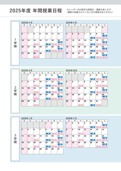 1学期2学期3学期カレンダー内の数字は授業日・講数を表します(講数の記載されていない日の授業はありません)2025年度年間授業日程日月火水木金土3講3講3講3講4講4講4講4講4講5講5講5講5講5講6講6講6講6講6講12345678910111213141516171819202122232425262728293031日月火水木金土5講5講5講5講126講6講6講6講7講6講7講7講8講7講8講7講8講123456789101113141516171819202122232425262728293031日月火水木金土4講4講3講4講4講4講5講5講5講5講6講5講6講6講6講6講12345678910111213141516171819202122232425262728日月火水木金土1講1講1講1講1講2講2講2講2講2講3講日月火水木金土1講1講1講1講1講2講2講2講2講2講3講3講3講3講3講4講4講4講4講4講5講1234567891011121314151617181920212223242526272829302025年4月2025年9月2026年1月2025年5月2025年10月2026年2月日月火水木金土1講1講1講1講2講2講1講2講2講3講3講2講3講3講12345678910111213141516171819202122232425262728293031123456789101112131415161718192021222324252627282930