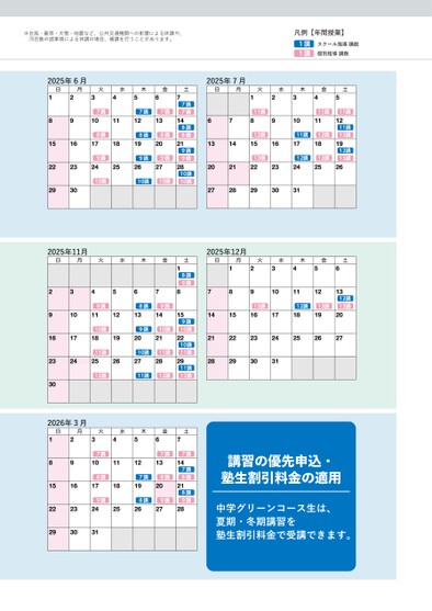※台風・豪雨・大雪・地震など、公共交通機関への影響による休講や、河合塾の諸事情による休講の場合、補講を行うことがあります。2025年6月日月18291516222329302025年11月日月2931016172324302026年3月日月182915162223火37講108講179講2410講水4木5金67講7講11121318258講199講268講209講2710講10講土77講7講148講8講219講9講2810講10講火水木金49講1110講1811講2512講512678講139講149講10講19202110講11講26272811講12講土18講9講8159講10講2210講11講2911講12講火37講108講179講24水4木511127講198講261825金67講138講209講27土77講147講8講218講9講28293031凡例【年間授業】1講1講スクール指導講数個別指導講数水木3金4土511講11講101111講12講16171812講13講2324251211講12講1912講13講26292025年7月日月6713142021火111講812講1513講2227282930312025年12月日月71829火水3木4金5土6101112141513講1612講13講1718191312講13講202122232425262728293031講習の優先申込・塾生割引料金の適用中学グリーンコース生は、夏期・冬期講習を塾生割引料金で受講できます。