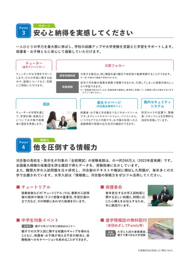 Point3サポート安心と納得を実感してください一人ひとりの学力を最大限に伸ばし、学校の成績アップや大学受験を見据えた学習をサポートします。保護者・お子様ともに安心して通塾していただけます。チューター(進学アドバイザー)チューターがお子様をサポートします。日々の学習に関する悩みや、進路についてなど、気軽にご相談いただけます。面談チューターが年間を通じて、学習計画・進路などについてお子様や保護者と面談を実施します。欠席フォロー振替受講制度欠席する場合は、同じ講座を違う曜日や他校舎で振替受講することができます。※一部、対象外の講座や校舎があります。映像視聴自宅で河合塾の授業を映像で視聴できるため、欠席してしまった授業内容もしっかり学習できます。※一部授業を除きます。なお、映像授業の講師は、通常時に受講している講師と異なる場合がありますのでご了承ください。塾生マイページ(河合塾生専用サイト)保護者・お子様と河合塾をつなぐサポートツールです。タブレットやスマートフォン、パソコンから、いつでもアクセス可能です。お子様の校舎への入退館情報や授業の出欠状況の確認ができます。館内セキュリティシステム防犯カメラの設置や、警備員・スタッフによる定期的な巡回を実施しています。Point4情報力他を圧倒する情報力河合塾の高校生・高卒生が対象の「全統模試」の受験者数は、のべ約266万人(2023年度実績)です。全国最大規模の母集団を誇る模試で得たデータを、受験指導に生かしています。また、難関大学の入試問題を日々研究し、河合塾のテキストや模試に類似した問題が、毎年多くの大学で出題されています。大学入試は「情報戦」。河合塾の情報力をぜひフル活用してください。■チュートリアル授業前後などの「チュートリアル」では、最新の入試情報の提供や模試・テスト受験の重要性、学習計画の立て方など、その時期にあわせた指導を行います。■保護者会毎年変化する大学入試制度に関する正しい知識と、時期に応じた心構えをお伝えするため、年に数回行います。■中学生対象イベント実施例親子で学ぶ!大学入試Webセミナー親子での大学入試に関する知識のギャップを埋めるとともに、保護者・お子様が抱える不安の解消と、受験勉強へのモチベーションを高めることができます。■進学情報誌の無料配付(栄冠めざしてFamily等)掲載内容例大学と入試の基礎講座、親子で乗り切る大学受験※実施状況は校舎により異なります。