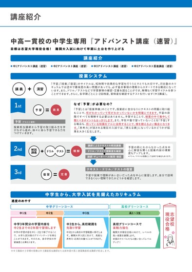中高一貫校の中学生専用『アドバンスト講座(速習)』目標は志望大学現役合格!難関大入試に向けて早期に土台を作り上げる講座紹介●中1アドバンスト講座(速習)●中2アドバンスト講座(速習)●中3アドバンスト講座(速習)●中3アドバンスト医進講座(速習)授業システム講義演習「予習」授業」「復習」のサイクルは、短時間で効果的な学習を行ううえでとても大切です。河合塾のカリキュラムでは途中で難易度の高い問題があっても、必ず基本事項の理解からスタートできる構成になっています。また、ドリル/テストなどで学習事項の確認・定着を図ることができ、無理なく学習サイクルを保つことができます。さらに、各学期ごとに1・2回程度、習得度を確認するテストを行います(中3講座)。1st予習発見予習(テキスト使用)授業担当講師から予習の取り組み方を学びながら進め、徐々に自ら予習できる力をつけていきます。なぜ「予習」が必要なの?「予習」とは「授業準備」のことです。授業前に自分なりにテキストの問題に取り組むことで、何がわかっていて何がわかっていないかを明確にできます。予習の段階ですべてを理解する必要はありません。予習することで、授業の中で集中して聞くべきポイントもはっきりします。また、学校や塾で習っていないことを「予習」する場合も、持っている知識をフルに活用することで、頭を鍛えるよい機会になります。「思考力」が試される現在の入試では、使える頭」になっているかどうかが結果を大きく左右します。2nd3rd解説講義ドリルテスト理解ドリル/テストで理解度を確認講師によるテキストの解説講義講師・チューターへの質問・確認予習の時にわからなかった点を中心に解説を聞くと授業内容の理解度もアップします。*ドリル/テストは宿題として活用する場合もあります。復習定着予習や授業で理解があいまいだった点を中心に復習します。自分で説明できるくらい理解できたかどうかを確認します。テキスト・ドリル/テストの復習志望校現役合格中学生から、大学入試を見据えたカリキュラム進度のめやす中学グリーンコース中1生中2生中3生高校グリーンコース高1〜3生中学3年間分の学習内容を中2生までの2年間で習得します中学の学習内容を中1・2生で修了することで、大学入試対策のアドバンテージを得ることができます。そのため、各中学校の学習進度とは異なります。中3生から、高校範囲を先取り学習中3生から高校の学習範囲に移行します。難関大学入試に向けて、高度な思考力・応用力を養うことができます。高校グリーンコースで実戦力強化難関大学現役合格に向けて、レベルの高い授業を展開します。全国のライバルたちと競い合ってレベルアップ!※中3講座の3学期の授業は中3講座担当講師または新年度の高1速習講座担当講師が担当します。講座紹介