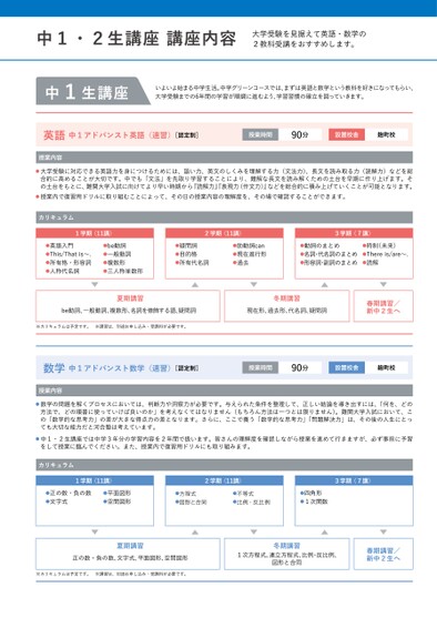 中1・2生講座講座内容大学受験を見据えて英語・数学の2教科受講をおすすめします。中1生講座いよいよ始まる中学生活。中学グリーンコースでは、まずは英語と数学という教科を好きになってもらい、大学受験までの6年間の学習が順調に進むよう、学習習慣の確立を図っていきます。英語中1アドバンスト英語(速習)[認定制]授業時間90分設置校舎麹町校授業内容大学受験に対応できる英語力を身につけるためには、語い力、英文のしくみを理解する力(文法力)、長文を読み取る力(読解力)などを総合的に高めることが大切です。中でも「文法」を先取り学習することにより、難解な長文を読み解くための土台を早期に作り上げます。その土台をもとに、難関大学入試に向けてより早い時期から『読解力』『表現力(作文力)』などを総合的に積み上げていくことが可能となります。授業内で復習用ドリルに取り組むことによって、その日の授業内容の理解度を、その場で確認することができます。カリキュラム1学期〈11講〉2学期〈11講〉3学期〈7講〉●英語入門●This/Thatis〜.●所有格・形容詞●人称代名詞●be動詞●一般動詞●複数形●三人称単数形●疑問詞●目的格●所有代名詞●助動詞can●現在進行形●過去●動詞のまとめ●名詞・代名詞のまとめ●形容詞・副詞のまとめ●時制(未来)●Thereis/are〜.●読解夏期講習冬期講習be動詞、一般動詞、複数形、名詞を修飾する語、疑問詞現在形、過去形、代名詞、疑問詞春期講習/新中2生へ※カリキュラムは予定です。※講習は、別途お申し込み・受講料が必要です。数学中1アドバンスト数学(速習)[認定制]授業時間90分設置校舎麹町校授業内容数学の問題を解くプロセスにおいては、判断力や洞察力が必要です。与えられた条件を整理して、正しい結論を導き出すには、「何を、どの方法で、どの順番に使っていけば良いのか」を考えなくてはなりません(もちろん方法は一つとは限りません)。難関大学入試において、この「数学的な思考力」の差が大きな得点力の差となります。さらに、ここで養う「数学的な思考力」「問題解決力」は、その後の人生にとっても大切な能力だと河合塾は考えています。中1・2生講座では中学3年分の学習内容を2年間で扱います。皆さんの理解度を確認しながら授業を進めて行きますが、必ず事前に予習をして授業に臨んでください。また、授業内で復習用ドリルにも取り組みます。カリキュラム1学期〈11講〉●正の数・負の数●文字式●平面図形●空間図形2学期〈11講〉3学期〈7講〉●方程式●図形と合同●不等式●比例・反比例●四角形●1次関数夏期講習正の数・負の数、文字式、平面図形、空間図形冬期講習1次方程式、連立方程式、比例・反比例、図形と合同春期講習/新中2生へ※カリキュラムは予定です。※講習は、別途お申し込み・受講料が必要です。