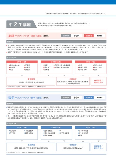 [認定制]…受講には認定(受講資格)が必要です。認定の取得方法は13ページをご確認ください。中2生講座中高一貫校の方にとって、中学の勉強を完成させなければならない学年です。高校範囲の学習に向けて万全の基礎固めをします。英語中2アドバンスト英語(速習)[認定制]授業時間90分設置校舎麹町校授業内容大学受験において必要とされる総合的な英語力(語彙力・文法力・読解力)を高めるカリキュラムで授業を行います。まずは「文法」を項目順に先取り学習し、それを抽象度の高い英文でさえも読み解くことのできる「真の読解力」の構築へと繋げます。また、「読む・書く・聞く・話す」という語学4技能のひとつである、「書く」力も早い時期から伸ばすよう工夫した教材を使用します。授業内で復習用ドリルに取り組むことによって、その日の授業内容の理解度を、その場で確認することができます。カリキュラム1学期〈11講〉●時制のまとめ●助動詞●文型●不定詞●動名詞●接続詞2学期〈11講〉●不定詞を含む重要表現●名詞節と時制の一致●比較●現在完了●受動態3学期〈7講〉●分詞●関係代名詞●語のまとめ●句のまとめ●節のまとめ●読解夏期講習助動詞、文型、不定詞、動名詞、接続詞冬期講習比較、現在完了、受動態、不定詞を含む重要表現、名詞節と時制の一致春期講習/新中3生へ※カリキュラムは予定です。※講習は、別途お申し込み・受講料が必要です。数学中2アドバンスト数学(速習)[認定制]授業時間90分設置校舎麹町校授業内容難関大学の数学の問題を解くプロセスにおいては、判断力や洞察力が必要です。与えられた条件を整理して、正しい結論を導き出すには、「何を、どの方法で、どの順番に使っていけば良いのか」を考えなくてはなりません(もちろん方法は一つとは限りません)。難関大学入試において、この「数学的な思考力」の差が大きな得点力の差となります。さらに、ここで養う「数学的な思考力」「問題解決力」は、その後の人生にとっても大切な能力だと河合塾は考えています。中1・2生講座では中学3年分の学習内容を2年間で扱います。皆さんの理解度を確認しながら授業を進めて行きますが、必ず事前に予習をして授業に臨んでください。また、授業内で復習用ドリルにも取り組みます。カリキュラム1学期〈11講〉2学期〈11講〉3学期〈7講〉●式の計算●平方根●2次方程式●図形と相似●図形と相似●線分の比と計量●関数y=ax²●円●三平方の定理●三平方の定理●データの活用●確率夏期講習冬期講習展開・因数分解、平方根、2次方程式、図形と相似図形と相似、円、関数y=ax²春期講習/新中3生へ※カリキュラムは予定です。※講習は、別途お申し込み・受講料が必要です。