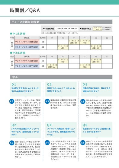 年間授業講数1学期11講、2学期11講、3学期7講時間割の見方17:30〜19:00成合授業時間帯担当講師名講座名授業分数月火水木金土中1アドバンスト英語(速習)90中1アドバンスト数学(速習)9017:00~18:30髙橋(保)18:00~19:30秋谷17:30~19:00成合19:50~21:20佐藤(健)校舎麹町校■中1生講座※同一名称の講座は曜日・時間帯が異なっても同一内容です。講座名授業分数月火水木金土中2アドバンスト英語(速習)9019:00~20:30秋谷17:30~19:00髙橋(保)中2アドバンスト数学(速習)9017:30~19:00高梨(由)17:30~19:00塚本校舎麹町校■中2生講座Q&AQ1河合塾に入塾するためにテストを受ける必要はありますか?Q3授業でわからないことがあったら質問できますか?Q5授業の前後に勉強や、飲食できる場所はありますか?A1中学グリーンコースは、「認定テスト」を実施しています。認定テストで基準を満たすことで、認定(受講資格)が取得できます。認定取得後は、受講開始日の4日前までにお申し込みください(詳細は13ページをご覧ください)。A3授業の前後に講師室で講師に質問ができます。さらに学校の授業でわからないところも、質問できます。A5河合塾各校舎には自習室を設置しています。また、飲食や休憩のためのスペースがあり、軽食や飲料の自動販売機も設置しています(自習室の利用方法・ルールは各校舎にご確認ください)。Q21クラスの生徒数は何人くらいですか?また、座席は決まっていますか?Q4アドバンスト講座は“速習”ということですが、授業進度が知りたいです。Q6高校生になってからも河合塾に通うことはできますか?A2校舎・講座により異なりますが、10〜20名くらいの少人数制です。座席は指定席です。指定された席では黒板が見えないなど、受講上支障がある場合には校舎スタッフか講師にご相談ください。A4おおよそ1年先取りで進んでいきます。ただし、やみくもに速く進めるのではなく、少人数での授業で、理解度を確認しながら進めていきます(詳細は中3生講座は9・10ページ、中1・2生講座は7・8ページをご覧ください)。A6中学グリーンコースから河合塾の各校舎に設置されている高校グリーンコースに進級できます。中学グリーンコース生は、高校グリーンコースでも学校と同様に中高一貫の速習の進度で学習していくことが可能です。時間割/Q&A中1・2生講座時間割