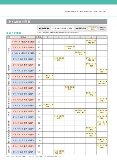 ※担当講師は変更になる場合がありますのであらかじめご了承ください。中3生講座時間割年間授業講数1学期13講、2学期13講、3学期9講時間割の見方17:10〜18:40森(千)授業時間帯担当講師名■中3生講座※同一名称の講座は設置校舎・曜日・時間帯が異なっても同一内容です。校舎講座名授業分数月火水木金土16:30~18:40成合17:00~19:10中村(隆)17:10~18:40中島16:30~18:00押田18:30~20:40塚本17:10~18:40森(千)16:00~18:10今田17:30~19:00藤田17:20~18:50押田19:20~21:30塚本17:10~19:20田井19:30~21:00髙橋(保)17:10~19:20佐藤(健)17:30~19:00青柳19:10~20:40藤田19:30~21:40竹内19:30~21:00髙橋(保)17:40~19:50合田19:30~21:40流川19:20~20:50金谷19:20~21:30高梨(由)アドバンスト医進英語(速習)90アドバンスト英語(速習)90アドバンスト医進数学(速習)120アドバンスト数学(速習)120アドバンスト英語(速習)90アドバンスト数学(速習)120アドバンスト英語(速習)9018:00~19:30近藤アドバンスト数学(速習)120アドバンスト英語(速習)90アドバンスト数学(速習)120アドバンスト英語(速習)90アドバンスト数学(速習)12019:00~21:10竹内アドバンスト英語(速習)90アドバンスト数学(速習)120アドバンスト英語(速習)90アドバンスト数学(速習)120アドバンスト英語(速習)90アドバンスト数学(速習)120アドバンスト英語(速習)90アドバンスト数学(速習)120麹町校新宿校池袋校(本館)自由が丘校吉祥寺現役館横浜校あざみ野現役館南浦和現役館津田沼校※アドバンスト医進数学(速習)・アドバンスト数学(速習)には休憩時間が含まれています。