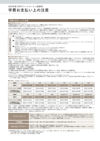 ●初回学費のお支払いについて受講開始希望日の4日前までにお申し込みのうえ、学費のお支払いを完了させてください。※教材は受講校舎にて配付します。余裕をもってお申し込みください。お申し込み時に指定された決済手段でお支払いください。初回授業料の決済手段は、「クレジットカード」「コンビニエンスストア」「Pay-easy(ペイジー)」の3つの決済手段から選択できます。画面の案内をご確認のうえお手続きをお願いいたします。なお、河合塾校舎窓口ではお支払いになれません。コンビニエンスストアならびにPay-easy(ペイジー)を選択された場合でも、振込用紙の送付はございません。お支払いに必要な番号は、申込マイページにてご確認ください。各決済手段の注意事項は、以下をご覧ください。●クレジットカード・ご利用可能なカードの種類はVisa、Mastercard、JCB、AMERICANEXPRESS、DinersClubInternational、Discoverです。・ご利用代金明細書には、「学校法人河合塾」または「ガッコウホウジンカワイジュク」と表示されます。●コンビニエンスストア・お支払い可能なコンビニエンスストアは、セブンーイレブン、ローソン、ファミリーマート、ミニストップ、セイコーマート、デイリーヤマザキです。・お支払い合計金額が30万円以上の場合は、コンビニエンスストアでのお支払いはご利用になれません。・お支払い手続きの方法は、各コンビニエンスストアで異なります。●Pay-easy(ペイジー)・Pay-easy(ペイジー)マークのあるATM/インターネットバンキングでのお支払いが可能です。・ATMでは、10万円を超える現金でのお振り込みができませんのでご注意ください。・ATM画面やインターネットバンキング画面には払込先名として「学校法人河合塾」が表示されます。・ATMによる現金での払い込みや、休日夜間などご利用時間帯によっては手数料がかかる場合があります。詳細はご利用になる金融機関にお問い合わせください。各決済手段の注意事項学費お支払い上の注意2025年度中学グリーンコース入塾要項学費お支払い上の注意●2回目以降のお支払いについて学費の支払方法(月払い・一括払い)にかかわらず、2回目以降のお支払いには決済手段の登録をお願いしております。2回目以降の決済手段は、「クレジットカード」「口座振替」「Pay-easy(ペイジー)」の3つの手段から登録できます。初回支払いにクレジットカードを指定された場合、2回目以降も自動でクレジットカード情報が登録されます。決済手段の変更は、[申込マイページ]から変更をお願いいたします。ご登録の決済手段から下記の①〜④につきまして、決済をいたします。①学費の支払方法に月払いを選択した場合の2回目以降の授業料・塾生サポート料②受講講座の追加・変更による差額請求③夏期講習、冬期講習、春期講習の受講料④ご登録の決済手段を前提として受け付けする河合塾指定の商品(有料イベント料金・再発行などの各種料金)※返金が生じた場合、メールでお知らせします。[【河合塾】返金手続き(返金口座登録)のご案内]メールをご確認のうえ、[申込マイページ]からお手続きをお願※クレジットカード情報または振替口座の登録が完了するまでは、「Pay-easy(ペイジー)」でのお支払いとなります。※2025/3/31(月)までの進級生(2024年度塾生)は、初回受講開始月からご登録の決済手段でのご請求となります。決済手段の変更を希望する場合は、[申込マイペーいいたします。ジ]から変更・登録してください。●ご請求・お支払いスケジュール4月受講月5月6月7月8月9月清算日2025/5/5(月・祝)2025/6/5(木)2025/7/5(土)2025/8/5(火)2025/9/5(金)2025/10/5(日)クレジットカード決済日2025/5/8木)2025/6/8日)2025/7/8(火)2025/8/8(金)2025/9/8(月)2025/10/8(水)口座振替日またはPay-easy支払期限日受講月清算日2025/5/27火)2025/6/27(金)2025/7/28(月)2025/8/27(水)2025/9/29(月)2025/10/27(月)10月11月12月2026年1月2026年2月2026年3月2025/11/5水)2025/12/5(金)2026/1/7(水)2026/2/5(木)2026/3/5(木)2026/4/5(日)クレジットカード決済日2025/11/8土)2025/12/8(月)2026/1/10(土)2026/2/8(日)2026/3/8(日)2026/4/8(水)口座振替日またはPay-easy支払期限日2025/11/27木)2025/12/29(月)2026/1/27(火)2026/2/27(金)2026/3/27(金)2026/4/27(月)毎月、7日頃に[【河合塾】学費確定(月次精算)のご案内]メールをお送りいたします(メールの送信日は前後する場合があります)。月払いの場合、授業料と塾生サポート料は、以下の各月の指定日に決済いたします。なお、一括払いの場合の講座追加・変更時のご精算、ご登録の決済手段を前提として受け付けする河合塾指定の商品は、発生時のみのご請求となります。※ご請求・お支払いスケジュールは、一部変更となる場合があります。クレジットカード口座振替毎月8日にご登録のクレジットカードから決済します(ただし、12月受講分の決済日は2026年1月10日となります)。何らかの理由により決済できなかった場合は、メールでお知らせし、17日、27日に再度自動で決済します。決済日はクレジットカードの支払日と同一ではありません。クレジットカードの