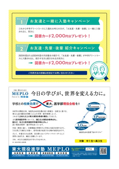 キャンペーン1お友達と一緒に入塾キャンペーンこれから中学グリーンコースに入塾をお考えの方が、「お友達・先輩・後輩」と一緒に入塾されると、双方に図書カード2,000円分プレゼント!キャンペーン2お友達・先輩・後輩紹介キャンペーン2025年度または2024年度の河合塾生の紹介で、「お友達・先輩・後輩」が中学グリーンコースに入塾されると、紹介する方と紹介される方双方に図書カード2,000円分プレゼント!ご利用方法の詳細は校舎までお問い合わせください