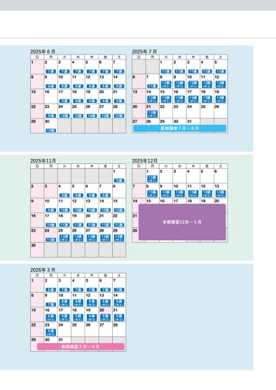火3水4木5金6土7火1水2木3金4土52025年7月日月2025年6月日月18297講7講7講7講7講7講10111213148講8講8講8講8講8講151617181920219講9講9講9講9講222324252627289講10講10講10講10講10講293010講613202711講11講11講11講11講78910111211講1412講(中3)2113講(中3)2812講(中3)12講(中3)12講(中3)12講(中3)12講(中3)151617181913講(中3)13講(中3)13講(中3)13講(中3)13講(中3)22232425263029夏期講習7月〜8月312025年11月日月火水木金土345679講9講9講9講189講2025年12月日月112講(中3)火水3木4金5土6101112132913講(中3)13講(中3)13講(中3)13講(中3)13講(中3)13講(中3)78101112131415141516171819209講10講10講10講10講10講161718192021222122232425262710講11講11講11講11講11講冬期講習12月〜1月232425262728292829303111講12講(中3)12講(中3)12講(中3)12講(中3)12講(中3)3029181522292026年3月日月火3水4木5金6土76講7講7講7講7講7講297講168講(中3)239講(中3)3010111213148講(中3)8講(中3)8講(中3)8講(中3)8講(中3)17181920219講(中3)9講(中3)9講(中3)9講(中3)9講(中3)242526272831春期講習3月〜4月