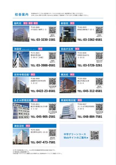 校舎案内校舎Webサイトでは、各校舎スタッフからのお知らせや、施設案内がご覧いただけます。お申し込みに関するお問い合わせは、各校舎にて随時承っております。お気軽にお電話ください。麹町校中1中2中3新宿校中3〒102-0085千代田区六番町1-3麹町校WebサイトTEL:03-3230-1581〒160-0023新宿区西新宿7-12-1新宿校WebサイトTEL:03-3362-6581池袋校授業は本館で行います。中3自由が丘校中3〒171-0021豊島区西池袋2-29-17[本館]池袋校WebサイトTEL:03-3988-0581吉祥寺現役館*中3横浜校中3〒180-0004武蔵野市吉祥寺本町1-8-12吉祥寺現役館WebサイトTEL:0422-23-6581〒152-0035目黒区自由が丘1-15-13自由が丘校WebサイトTEL:03-5726-3261〒220-0004横浜市西区北幸2-11-6横浜校WebサイトTEL:045-312-6581あざみ野現役館*中3南浦和現役館*中3津田沼校中3〒225-0011横浜市青葉区あざみ野1-1-12あざみ野現役館WebサイトTEL:045-905-2581〒275-0026習志野市谷津1-15-33津田沼校WebサイトTEL:047-473-7581※(学)河合塾主催。ただし、*は(株)河合塾進学研究社主催の校舎です。※「現役館」は登録商標です。※各校舎へのアクセス(路線・出口の案内)は、校舎Webサイトにてご確認ください。〒336-0017さいたま市南区南浦和2-24-6南浦和現役館WebサイトTEL:048-884-7581中学グリーンコースWebサイトのご案内▲