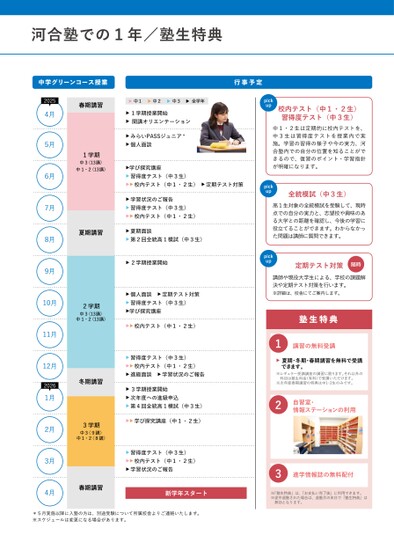 河合塾での1年/塾生特典中学グリーンコース授業行事予定▼▼▼▼中1中2中3▼▼1学期授業開始開講オリエンテーション全学年pickup校内テスト(中1・2生)習得度テスト(中3生)▼▼みらいPASSジュニア*個人面談▼学び探究講座▼習得度テスト(中3生)▼▼校内テスト(中1・2生)▼定期テスト対策▼▼学習状況のご報告習得度テスト(中3生)▼▼校内テスト(中1・2生)▼▼夏期面談第2回全統高1模試(中3生)▼2学期授業開始▼▼個人面談▼定期テスト対策習得度テスト(中3生)▼学び探究講座▼▼校内テスト(中1・2生)▼習得度テスト(中3生)▼▼校内テスト(中1・2生)▼進級面談▼学習状況のご報告▼▼▼3学期授業開始次年度への進級申込第4回全統高1模試(中3生)▼▼学び探究講座(中1・2生)▼習得度テスト(中3生)▼▼校内テスト(中1・2生)▼学習状況のご報告中1・2生は定期的に校内テストを、中3生は習得度テストを授業内で実施。学習の習得の様子や今の実力、河合塾内での自分の位置を知ることができるので、復習のポイント・学習指針が明確になります。pickup全統模試(中3生)高1生対象の全統模試を受験して、現時点での自分の実力と、志望校や興味のある大学との距離を確認し、今後の学習に役立てることができます。わからなかった問題は講師に質問できます。pickup定期テスト対策随時講師や現役大学生による、学校の課題解決や定期テスト対策を行います。※詳細は、校舎にてご案内します。塾生特典1講習の無料受講▼夏期・冬期・春期講習を無料で受講できます。※レギュラー受講講座の講習に限ります。それ以外の科目は塾生料金(有料)で受講いただけます。※次年度春期講習の特典は中1・2生のみです。2自習室・情報ステーションの利用3進学情報誌の無料配付※「塾生特典」は、「お支払い完了後」に利用できます。※途中退塾された場合は、退塾月の末日で「塾生特典」は無効となります。春期講習1学期中3〈13講〉中1・2〈13講〉夏期講習2学期中3〈13講〉中1・2〈13講〉冬期講習3学期中3〈9講〉中1・2〈8講〉20254月5月6月7月8月9月10月11月12月20261月2月3月4月春期講習新学年スタート*5月実施以降に入塾の方は、別途受験について所属校舎よりご連絡いたします。※スケジュールは変更になる場合があります。
