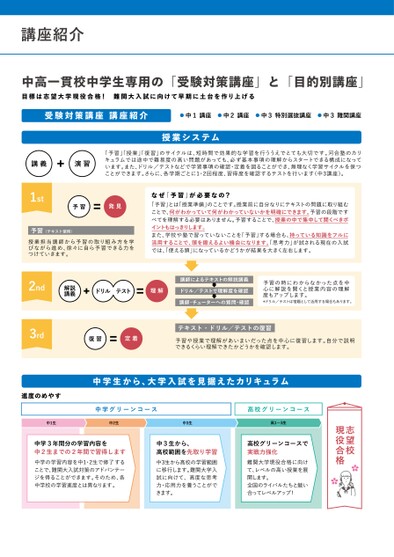 中高一貫校中学生専用の「受験対策講座」と「目的別講座」目標は志望大学現役合格!難関大入試に向けて早期に土台を作り上げる受験対策講座講座紹介●中1講座●中2講座●中3特別選抜講座●中3難関講座授業システム講義演習「予習」授業」「復習」のサイクルは、短時間で効果的な学習を行ううえでとても大切です。河合塾のカリキュラムでは途中で難易度の高い問題があっても、必ず基本事項の理解からスタートできる構成になっています。また、ドリル/テストなどで学習事項の確認・定着を図ることができ、無理なく学習サイクルを保つことができます。さらに、各学期ごとに1・2回程度、習得度を確認するテストを行います(中3講座)。1st予習発見予習(テキスト使用)授業担当講師から予習の取り組み方を学びながら進め、徐々に自ら予習できる力をつけていきます。なぜ「予習」が必要なの?「予習」とは「授業準備」のことです。授業前に自分なりにテキストの問題に取り組むことで、何がわかっていて何がわかっていないかを明確にできます。予習の段階ですべてを理解する必要はありません。予習することで、授業の中で集中して聞くべきポイントもはっきりします。また、学校や塾で習っていないことを「予習」する場合も、持っている知識をフルに活用することで、頭を鍛えるよい機会になります。「思考力」が試される現在の入試では、「使える頭」になっているかどうかが結果を大きく左右します。2nd3rd進度のめやす解説講義ドリルテスト理解ドリル/テストで理解度を確認講師によるテキストの解説講義講師・チューターへの質問・確認予習の時にわからなかった点を中心に解説を聞くと授業内容の理解度もアップします。*ドリル/テストは宿題として活用する場合もあります。復習定着予習や授業で理解があいまいだった点を中心に復習します。自分で説明できるくらい理解できたかどうかを確認します。テキスト・ドリル/テストの復習中学生から、大学入試を見据えたカリキュラム志望校現役合格中学グリーンコース高校グリーンコース中1生中2生中3生高1〜3生中学3年間分の学習内容を中2生までの2年間で習得します中学の学習内容を中1・2生で修了することで、難関大入試対策のアドバンテージを得ることができます。そのため、各中学校の学習進度とは異なります。中3生から、高校範囲を先取り学習中3生から高校の学習範囲に移行します。難関大学入試に向けて、高度な思考力・応用力を養うことができます。高校グリーンコースで実戦力強化難関大学現役合格に向けて、レベルの高い授業を展開します。全国のライバルたちと競い合ってレベルアップ!講座紹介