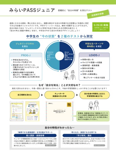 みらいPASSジュニア客観的に“自分の特徴”を測るテスト全員無料受験進路にかかわる興味・関心を見える化し、課題を解決する自分の特徴や生活習慣など多面的に測定できる河合塾オリジナルテストです。中学グリーンコース生は、無料で受験することができます。自分の強みである「ジェネリックスキル(学校や社会で求められる汎用的な能力)」と「自分の考え(意識や興味)」を知り、中学生の今から自分の将来をデザインしましょう!5/25(日)実施入塾時期により、受験可否についてご案内します。中学生の“今の状態”を2種のテストから測定ジェネリックスキルを測るPROG-J●学校生活はもちろん、大人になっても役立つ力●頭を使う力の「リテラシー」と、行動する力の「コンピテンシー」の2側面から測定●現実的な場面での妥当解を選んだり、その場面においてどのような行動をとるかを問う形式学力だけではない、普段見えにくい能力日々の過ごし方など、普段気づきにくい意識や行動学習生活パターンや興味関心を測定LEADS-J●時間の使い方●キャリアや周囲への意識●進路希望・進路意識●教科の好き嫌い●日々の成長感●学問への興味関心等にアンケート形式で回答高校入試をはさまない、中高一貫校に通う皆さんだからこそ、今後の学習習慣をしっかり作ることが必要になります!なぜ「自分を知る」ことが大切なの?自己理解を深めるチューターや保護者の方と共有自分自身の特徴をふまえた学習習慣を確立する受験後、保護者の方は「保護者ガイド」でテストの説明・受験結果の見方や活用方法をご確認いただけます。ぜひ、お子様と将来に向けてのお話をしてください。自分の特性がわかったら…「納得できる進路選択」を河合塾がサポート個人面談・進路指導考える力・表現する力を育てる「学び探究」講座チューターが受験結果を元に生徒一人ひとりにアドバイス。生徒の悩みの相談や、最新の入試情報や長年培った大学受験のノウハウを元に進路指導も行います。大学受験に向けての第一歩を踏み出しましょう。詳しくは4ページへ変わりゆく入試に対応する力はもちろん、社会でも役立つ力を自分で鍛える事は容易ではありません。中学グリーンコースの「学び探究」講座で基礎力を高めましょう。詳しくは10ページへ