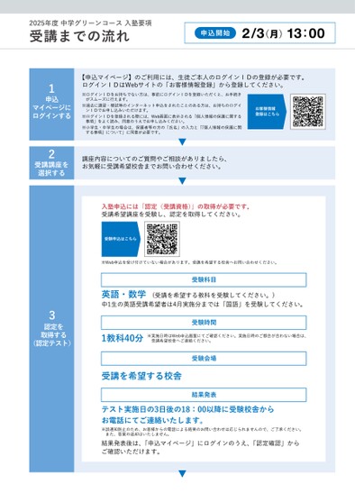 2025年度中学グリーンコース入塾要項受講までの流れ申込開始2/3(月)13:00【申込マイページ】のご利用には、生徒ご本人のログインⅠDの登録が必要です。ログインⅠDはWebサイトの「お客様情報登録」から登録してください。※ログインⅠDをお持ちでない方は、事前にログインⅠDを登録いただくと、お手続きがスムーズに行えます。※過去に講習・模試等のインターネット申込をされたことのある方は、お持ちのログインⅠDでお申し込みいただけます。※ログインⅠDを登録される際には、Web画面に表示される「個人情報の保護に関する事項」をよく読み、同意のうえでお申し込みください。※小学生・中学生の場合は、保護者等の方の「氏名」の入力と「『個人情報の保護に関する事項』について」に同意が必要です。お客様情報登録はこちら講座内容についてのご質問やご相談がありましたら、お気軽に受講希望校舎までお問い合わせください。入塾申込には「認定(受講資格)」の取得が必要です。受講希望講座を受験し、認定を取得してください。受験申込はこちら※Web申込を受け付けていない場合があります。受講を希望する校舎へお問い合わせください。受験科目英語・数学(受講を希望する教科を受験してください。)中1生の英語受講希望者は4月実施分までは「国語」を受験してください。受験時間1教科40分※実施日時はWeb申込画面にてご確認ください。実施日時のご都合が合わない場合は、受講希望校舎へご連絡ください。受講を希望する校舎受験会場結果発表テスト実施日の3日後の18:00以降に受験校舎からお電話にてご連絡いたします。※誤通知防止のため、お客様からの電話による結果のお問い合わせは応じられませんので、ご了承ください。また、答案の返却はいたしません。結果発表後は、「申込マイページ」にログインのうえ、「認定確認」からご確認いただけます。込1申マイページにログインする2受講講座を選択する3(認定テスト)認定を取得する