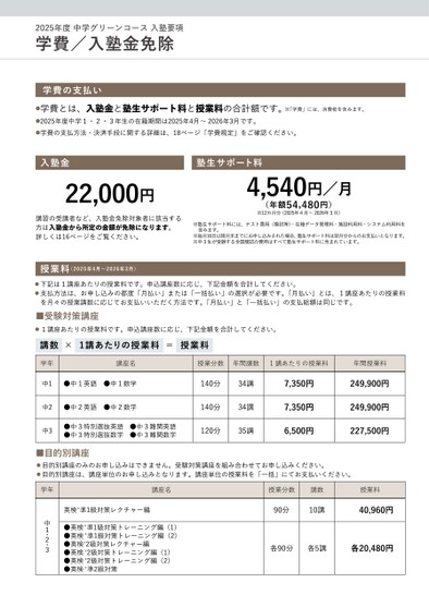 2025年度中学グリーンコース入塾要項学費/入塾金免除学費の支払い●学費とは、入塾金と塾生サポート料と授業料の合計額です。※「学費」には、消費税を含みます。●2025年度中学1・2・3年生の在籍期間は2025年4月〜2026年3月です。●学費の支払方法・決済手段に関する詳細は、18ページ「学費規定」をご確認ください。入塾金22,000円講習の受講者など、入塾金免除対象者に該当する方は入塾金から所定の金額が免除になります。詳しくは16ページをご覧ください。授業料(2025年4月〜2026年3月)塾生サポート料4,540円/月(年額54,480円)※12カ月分(2025年4月〜2026年3月)※塾生サポート料には、テスト費用(模試等)・在籍データ管理料・施設利用料・システム利用料を含みます。※毎月16日以降月末までにお申し込みされた場合、塾生サポート料は翌月分からのお支払いとなります。※中3生が受験する全国模試の費用はすべて塾生サポート料に含まれています。下記は1講座あたりの授業料です。申込講座数に応じ、下記金額を合計してください。支払方法は、お申し込みの都度「月払い」または「一括払い」の選択が必要です。「月払い」とは、1講座あたりの授業料を月々の授業講数に応じてお支払いいただく方法です。「月払い」と「一括払い」の支払総額は同じです。■受験対策講座1講座あたりの授業料です。申込講座数に応じ、下記金額を合計してください。講数×1講あたりの授業料=授業料学年講座名授業分数年間講数1講あたりの授業料年間授業料中1◉中1英語◉中1数学中2◉中2英語◉中2数学中3◉中3特別選抜英語◉中3難関英語◉中3特別選抜数学◉中3難関数学■目的別講座140分34講140分34講120分35講7,350円7,350円6,500円249,900円249,900円227,500円目的別講座のみのお申し込みはできません。受験対策講座を組み合わせてお申し込みください。目的別講座は、講座単位のお申し込みとなります。講座単位の授業料を「一括」にてお支払いください。講座名授業分数講数授業料英検®準1級対策レクチャー編◉英検®準1級対策トレーニング編(1)◉英検®準1級対策トレーニング編(2)◉英検®2級対策レクチャー編◉英検®2級対策トレーニング編(1)◉英検®2級対策トレーニング編(2)◉英検®準2級対策90分10講40,960円各90分各5講各20,480円学年中1・2・3