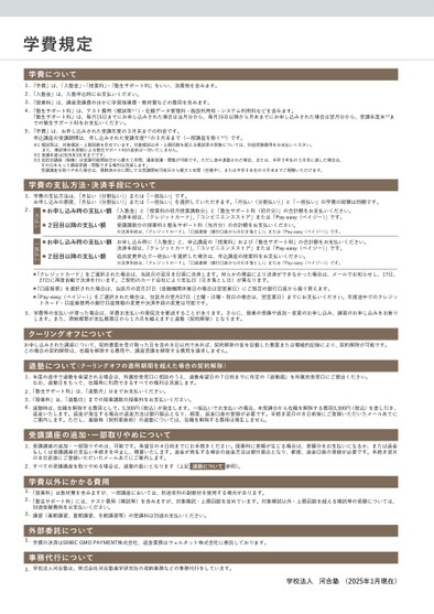 学費規定学費について1.2.3.4.5.「学費」は、「入塾金」・「授業料」・「塾生サポート料」をいい、消費税を含みます。「入塾金」は、入塾申込時にお支払いください。「授業料」は、講座受講費のほかに学習指導費・教材費などの費用を含みます。「塾生サポート料」は、テスト費用(模試等※1)・在籍データ管理料・施設利用料・システム利用料などを含みます。「塾生サポート料」は、毎月15日までにお申し込みされた場合は当月分から、毎月16日以降から月末までにお申し込みされた場合は翌月分から、受講年度末※2までの塾生サポート料をお支払いください。「学費」は、お申し込みされた受講年度の3月末までの料金です。申込講座の受講期間は、申し込みされた受講年度※2の3月末まで(一部講座を除く※3)です。※1模試等は、対象模試・上限回数を定めています。対象模試以外・上限回数を超える模試等の受験については、別途受験費用をお支払いください。また、模試等の未受験による塾生サポート料の返金は一切いたしません。※2受講年度は2026年3月末までです。※3目的別講座(映像)は受講可能開始日から最大1年間、講座受講・閲覧が可能です。ただし途中退塾された場合、または、中学3年生の3月末に達した場合は、その日をもって講座受講・閲覧できる権利は消滅します。受講講座を取りやめた場合は、視聴済み分に関しては受講開始可能日から最大1年間(在籍中)、または中学3年生の3月末までご視聴いただけます。学費の支払方法・決済手段について学費の支払方法は、「月払い(分割払い)」または「一括払い」です。お申し込みの都度、「月払い(分割払い)」または「一括払い」を選択していただきます。「月払い(分割払い)」と「一括払い」の学費の総額は同額です。お申し込み時の支払い額「入塾金」と「授業料の初月授業講数分」と「塾生サポート料(初月分)」の合計額をお支払いください。2回目以降の支払い額決済手段は、「クレジットカード」、「コンビニエンスストア」または「Pay-easy(ペイジー)」です。受講講数分の授業料と塾生サポート料(当月分)の合計額をお支払いください。※決済手段は、「クレジットカード」、「口座振替(銀行口座からの引き落とし)」または「Pay-easy(ペイジー)」です。お申し込み時の支払い額2回目以降の支払い額お申し込み時に「入塾金」と、申込講座の「授業料」および「塾生サポート料」の合計額をお支払いください。決済手段は、「クレジットカード」、「コンビニエンスストア」または「Pay-easy(ペイジー)」です。追加変更申込で一括払いを選択した場合は、申込講座の授業料をお支払いください。※決済手段は、「クレジットカード」、「口座振替(銀行口座からの引き落とし)」または「Pay-easy(ペイジー)」です。月払い一括払い1.2.「クレジットカード」をご選択された場合は、当該月の翌月8日頃に決済します。何らかの理由により決済ができなかった場合は、メールでお知らせし、17日、27日に再度自動で決済を行います。ご契約のカード会社により支払日(引き落とし日)が異なります。「口座振替」を選択された場合は、当該月の翌月27日(金融機関休業日の場合は翌営業日)にご指定の銀行口座から振り替えます。「Pay-easy(ペイジー)」をご選択された場合は、当該月の翌月27日(土曜・日曜・祝日の場合は、翌営業日)までにお支払いください。年度途中でのクレジットカード・口座振替用の銀行口座情報の変更や決済手段の変更は可能です。3.学費等の支払いが滞った場合は、学費お支払いの督促文を郵送することがあります。さらに、授業の受講や追加・変更のお申し込み、講習のお申し込みをお断りします。また、滞納期間が支払期限日から1カ月を越えますと退塾(契約解除)となります。クーリングオフについてお申し込みされた講座について、契約書面を受け取った日を含め8日以内であれば、契約解除の旨を記載した書面または電磁的記録により、契約解除が可能です。この場合の契約解除は、在籍を解除する費用や、講座受講を解除する費用を請求しません。退塾について(クーリングオフの適用期間を超えた場合の契約解除)1.年度の途中で退塾を希望される場合は、所属校舎窓口に相談のうえ、退塾希望日の7日前までに所定の「退塾届」を所属校舎窓口にご提出ください。なお、退塾日をもって、在籍時に利用できるすべての権利は消滅します。「塾生サポート料」は、「退塾月」分までお支払いください。「授業料」は、「退塾日」までの授業講数の授業料をお支払いください。2.3.4.1.2.3.退塾時は、在籍を解除する費用として、3,300円(税込)が発生します。一括払いでお支払いの場合、未受講分から在籍を解除する費用3,300円(税込)を差し引き、返金いたします。返金が発生する場合の返金方法は銀行振込となり、都度、返金口座の登録が必要です。手続き翌月の8日前後にご登録いただいたメールあてにご案内します。ただし、進級時(契約更新前)の退塾について
