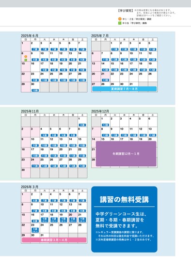 【学び探究】※日時は変更になる場合があります。また、校舎により実施日が異なります。詳細は10ページをご確認ください。11中1・2生「学び探究」講数中3生「学び探究」講数火1水2木3金4土52025年6月日月291118火3水4木5金6土72025年7月日月67講7講7講7講7講7講101112131411講11講11講11講11講7891011128講8講8講8講8講8講11講12講12講12講12講12講15161718192021131415161718199講9講9講9講9講12講13講13講13講13講13講22232425262728202122232425269講10講10講10講10講10講293010講13講28273029夏期講習7月〜8月31292025年11月日月火水木金34567土9講182025年12月日7月112講829火水3木4金5土6101112139講9講9講9講13講13講13講13講13講13講101112131415141516171819209講10講10講10講10講10講161718192021222122232425262710講11講11講11講11講11講冬期講習12月〜1月232425262728292829303111講12講12講12講12講12講302026年3月日月1829火3水4木5金6土76講7講7講7講7講7講10111213147講8講8講8講8講8講151617181920218講239講(中3)3022299講(中3)9講(中3)9講(中3)9講(中3)9講(中3)242526272831春期講習3月〜4月講習の無料受講中学グリーンコース生は、夏期・冬期・春期講習を無料で受講できます。※レギュラー受講講座の講習に限ります。それ以外の科目は塾生料金で受講いただけます。※次年度春期講習の特典は中1・2生のみです。
