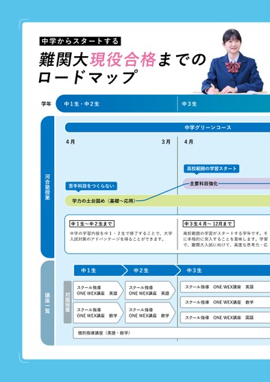 難関大現役合格までのロードマップ中学からスタートする学年中1生・中2生4月4月3月中3生河合塾授業講座一覧学力の土台固め(基礎〜応用)主要科目強化高校範囲の学習スタート苦手科目をつくらない中1生〜中2生まで中学の学習内容を中1・2生で修了することで、大学入試対策のアドバンテージを得ることができます。中3生4月〜12月まで高校範囲の学習がスタートする学年です。そに本格的に突入することを意味します。学習で、難関大入試に向けて、高度な思考力・応中3生中2生中1生スクール指導ONEWEX講座英語スクール指導ONEWEX講座英語スクール指導ONEWEX講座数学スクール指導ONEWEX講座国語個別指導講座(英語・数学)スクール指導ONEWEX講座英語中学グリーンコーススクール指導ONEWEX講座数学スクール指導ONEWEX講座数学対面授業