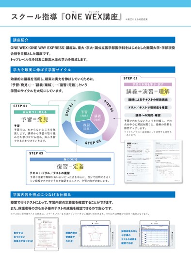 講座紹介ONEWEX(ONEWAYEXPRESS)講座は、東大・京大・国公立医学部医学科をはじめとした難関大学・学部現役合格を目標とした講座です。トップレベル生を対象に最高水準の学力を養成します。学力を確実に伸ばす学習サイクル効果的に講義を活用し、確実に実力を伸ばしていくために、「予習(発見)」→「講義(理解)」→「復習(定着)」という学習のサイクルを大切にしています。STEP01自ら気づく・考える予習=発見予習予習では、わからないところを発見します。講師から予習の取り組み方を学びながら進め、自ら予習できる力をつけていきます。STEP03講義(理解)予習(発見)復習(定着)身につける復習=定着テキスト・ドリル/テストの復習予習や授業で理解があいまいだった点を中心に、自分で説明できるくらい理解できたかどうかを確認することで、学習内容が定着します。STEP02学問の本質を学ぶ・試す講義+演習=理解講師によるテキストの解説講義ドリル/テストで理解度を確認講師への質問・確認予習でわからないところを把握し、その点を中心に解説を聞くと、授業の効果も断然アップします。*ドリル/テストは宿題として活用する場合もあります。▲成績画面イメージ931831.2.保護者等の方もお子様のテストの成績を確認できる!▲成績画面イメージ自分では気づけない改善点が見つかる!授業内容の習得度がわかる!学習内容を得点につなげる仕組み授業で行うテストによって、学習内容の定着度を確認することができます。また、保護者等の方もお子様のテストの成績を確認できるので安心です。※中3生の習得度テストの結果は、スマートフォンまたはタブレット等でご確認いただけます。それ以外は用紙での採点・返却となります。スクール指導『ONEWEX講座』ワンウェックス※集団による対面授業