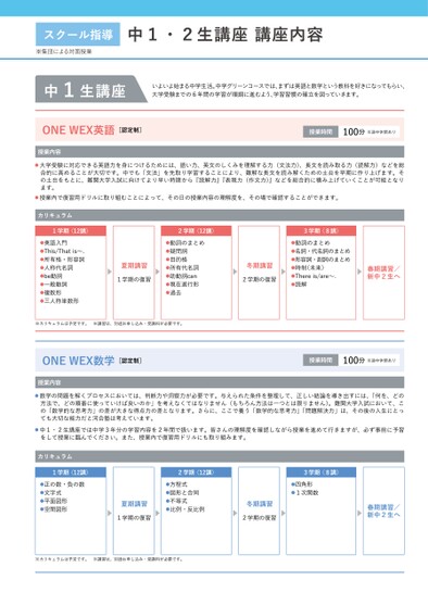 スクール指導※集団による対面授業中1生講座中1・2生講座講座内容いよいよ始まる中学生活。中学グリーンコースでは、まずは英語と数学という教科を好きになってもらい、大学受験までの6年間の学習が順調に進むよう、学習習慣の確立を図っていきます。ONEWEX英語[認定制]授業内容授業時間100分※途中休憩あり大学受験に対応できる英語力を身につけるためには、語い力、英文のしくみを理解する力(文法力)、長文を読み取る力(読解力)などを総合的に高めることが大切です。中でも「文法」を先取り学習することにより、難解な長文を読み解くための土台を早期に作り上げます。その土台をもとに、難関大学入試に向けてより早い時期から『読解力』『表現力(作文力)』などを総合的に積み上げていくことが可能となります。授業内で復習用ドリルに取り組むことによって、その日の授業内容の理解度を、その場で確認することができます。カリキュラム1学期〈12講〉●英語入門●This/Thatis〜.●所有格・形容詞●人称代名詞●be動詞●一般動詞●複数形●三人称単数形2学期〈12講〉●動詞のまとめ●疑問詞●目的格●所有代名詞●助動詞can●現在進行形●過去夏期講習1学期の復習3学期〈8講〉●動詞のまとめ●名詞・代名詞のまとめ●形容詞・副詞のまとめ●時制(未来)●Thereis/are〜.●読解冬期講習2学期の復習春期講習/新中2生へ※カリキュラムは予定です。※講習は、別途お申し込み・受講料が必要です。ONEWEX数学[認定制]授業内容授業時間100分※途中休憩あり数学の問題を解くプロセスにおいては、判断力や洞察力が必要です。与えられた条件を整理して、正しい結論を導き出すには、「何を、どの方法で、どの順番に使っていけば良いのか」を考えなくてはなりません(もちろん方法は一つとは限りません)。難関大学入試において、この「数学的な思考力」の差が大きな得点力の差となります。さらに、ここで養う「数学的な思考力」「問題解決力」は、その後の人生にとっても大切な能力だと河合塾は考えています。中1・2生講座では中学3年分の学習内容を2年間で扱います。皆さんの理解度を確認しながら授業を進めて行きますが、必ず事前に予習をして授業に臨んでください。また、授業内で復習用ドリルにも取り組みます。カリキュラム1学期〈12講〉●正の数・負の数●文字式●平面図形●空間図形2学期〈12講〉●方程式●図形と合同●不等式●比例・反比例夏期講習1学期の復習3学期〈8講〉●四角形●1次関数冬期講習2学期の復習春期講習/新中2生へ※カリキュラムは予定です。※講習は、別途お申し込み・受講料が必要です。