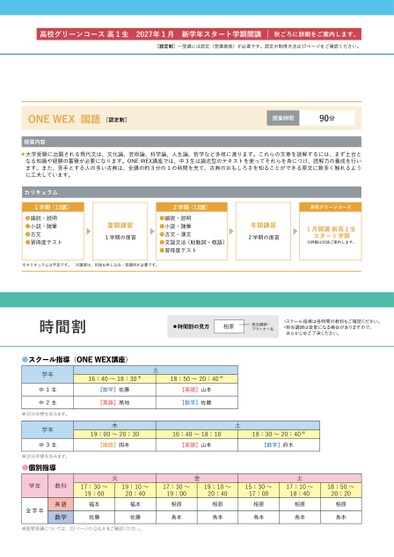 高校グリーンコース高1生2027年1月新学年スタート学期開講秋ごろに詳細をご案内します。[認定制]…受講には認定(受講資格)が必要です。認定の取得方法は17ページをご確認ください。ONEWEX国語[認定制]授業内容授業時間90分大学受験に出題される現代文は、文化論、芸術論、科学論、人生論、哲学など多岐に渡ります。これらの文章を読解するには、まず土台となる知識や経験の蓄積が必要になります。ONEWEX講座では、中3生は論述型のテキストを使ってそれらを身につけ、読解力の養成を行います。また、苦手とする人の多い古典は、全講の約3分の1の時間を充て、古典のおもしろさを知ることができる原文に数多く触れるように工夫しています。カリキュラム1学期〈13講〉●論説・説明●小説・随筆●古文●習得度テスト夏期講習1学期の復習2学期〈13講〉●論説・説明●小説・随筆●古文・漢文●文語文法(助動詞・敬語)●習得度テスト冬期講習2学期の復習※カリキュラムは予定です。※講習は、別途お申し込み・受講料が必要です。高校グリーンコース1月開講新高1生スタート学期※詳細は別途ご案内します。時間割時間割の見方相原担当講師・プランナー名•スクール指導は各時間の教科もご確認ください。•担当講師は変更になる場合がありますので、あらかじめご了承ください。●スクール指導(ONEWEX講座)16:40~18:30※18:50~20:40※土【数学】佐藤【英語】髙地木【英語】山本【数学】佐藤土19:00~20:3016:40~18:1018:30~20:40※【国語】岡本【英語】山本【数学】府木学年中1生中2生※10分休憩を含みます。学年中3生※10分休憩を含みます。●個別指導学年教科火金17:30~19:0019:10~20:4017:30~19:0019:10~20:4015:30~17:00全学年英語数学福本佐藤福本佐藤相原鳥本相原鳥本相原鳥本※振替受講については、23ページのQ&Aをご確認ください。土17:10~18:40相原鳥本18:50~20:20相原鳥本