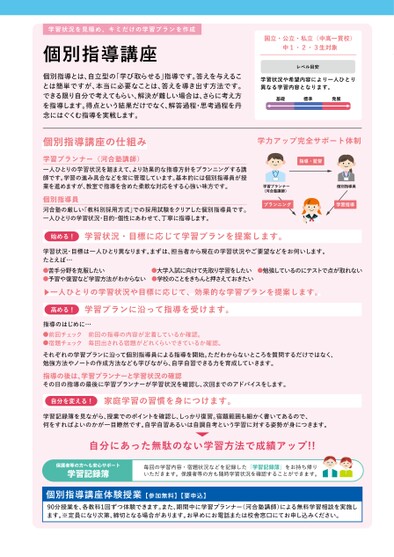 学習状況を見極め、キミだけの学習プランを作成個別指導講座個別指導とは、自立型の「学び取らせる」指導です。答えを与えることは簡単ですが、本当に必要なことは、答えを導き出す方法です。できる限り自分で考えてもらい、解決が難しい場合は、さらに考え方を指導します。得点という結果だけでなく、解答過程・思考過程を丹念にはぐくむ指導を実戦します。国立・公立・私立(中高一貫校)中1・2・3生対象レベル目安学習状況や希望内容により一人ひとり異なる学習内容となります。基礎標準発展個別指導講座の仕組み学習プランナー(河合塾講師)一人ひとりの学習状況を踏まえて、より効果的な指導方針をプランニングする講師です。学習の進み具合などを常に管理しています。基本的には個別指導員が授業を進めますが、教室で指導を含めた柔軟な対応をする心強い味方です。個別指導員河合塾の厳しい「教科別採用方式」での採用試験をクリアした個別指導員です。一人ひとりの学習状況・目的・個性にあわせて、丁寧に指導します。学力アップ完全サポート体制指導・監督学習プランナー(河合塾講師)プランニング個別指導員学習指導始める!学習状況・目標に応じて学習プランを提案します。学習状況・目標は一人ひとり異なります。まずは、担当者から現在の学習状況やご要望などをお伺いします。たとえば…●苦手分野を克服したい●大学入試に向けて先取り学習をしたい●勉強しているのにテストで点が取れない●予習や復習など学習方法がわからない●学校のことをきちんと押さえておきたい▶一人ひとりの学習状況や目標に応じて、効果的な学習プランを提案します。高める!学習プランに沿って指導を受けます。指導のはじめに…●前回チェック前回の指導の内容が定着しているか確認。●宿題チェック毎回出される宿題がどれくらいできているか確認。それぞれの学習プランに沿って個別指導員による指導を開始。ただわからないところを質問するだけではなく、勉強方法やノートの作成方法なども学びながら、自学自習できる力を育成していきます。指導の後は、学習プランナーと学習状況の確認その日の指導の最後に学習プランナーが学習状況を確認し、次回までのアドバイスをします。自分を変える!家庭学習の習慣を身につけます。学習記録簿を見ながら、授業でのポイントを確認し、しっかり復習。宿題範囲も細かく書いてあるので、何をすればよいのかが一目瞭然です。自学自習あるいは自調自考という学習に対する姿勢が身につきます。自分にあった無駄のない学習方法で成績アップ!!保護者等の方へも安心サポート学習記録簿毎回の学習内容・宿題状況などを記録した「学習記録簿」をお持ち帰りいただきます。保護者等の方も随時学習状況を確認することができます。個別指導講座体験授業【参加無料】要申込】90分授業を、各教科1回ずつ体験できます。また、期間中に学習プランナー(河合塾講師)による無料学習相談を実施します。※定員になり次第、締切となる場合があります。お早めにお電話または校舎窓口にてお申し込みください。