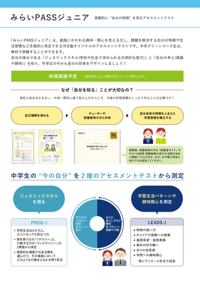 みらいPASSジュニア客観的に“自分の特徴”を測るアセスメントテスト「みらいPASSジュニア」は、進路にかかわる興味・関心を見える化し、課題を解決する自分の特徴や生活習慣など多面的に測定できる河合塾オリジナルのアセスメントテストです。中学グリーンコース生は、無料で受験することができます。自分の強みである「ジェネリックスキル(学校や社会で求められる汎用的な能力)」と「自分の考え(意識や興味)」を知り、中学生の今から自分の将来をデザインしましょう!秋頃実施予定入塾時期により、受験可否についてご案内します。なぜ「自分を知る」ことが大切なの?高校入試をはさまない、中高一貫校に通う皆さんだからこそ、今後の学習習慣をしっかり作ることが必要です!自己理解を深めるチューターや保護者等の方と共有自分自身の特徴をふまえた学習習慣を確立する受験後、保護者等の方は「保護者ガイド」でテストの説明・受験結果の見方や活用方法をご確認いただけます。ぜひ、お子様と将来に向けてのお話をしてください。中学生の“今の自分”を2種のアセスメントテストから測定ジェネリックスキルを測るPROG-J●学校生活はもちろん、大人になっても役立つ力●頭を使う力の「リテラシー」と、行動する力の「コンピテンシー」の2側面から測定●現実的な場面での妥当解を選んだり、その場面においてどのような行動をとるかを問う形式学力だけではない、普段見えにくい能力日々の過ごし方など、普段気づきにくい意識や行動学習生活パターンや興味関心を測定LEADS-J●時間の使い方●キャリアや周囲への意識●進路希望・進路意識●教科の好き嫌い●日々の成長感●学問への興味関心等にアンケート形式で回答