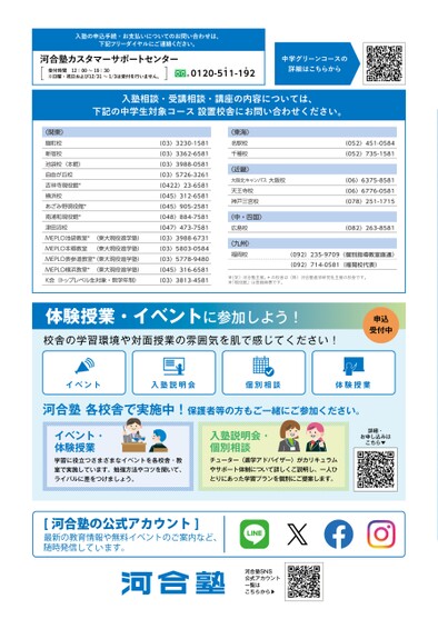 河合塾SNS公式アカウント一覧はこちらから▶体験授業・イベントに参加しよう!申込受付中校舎の学習環境や対面授業の雰囲気を肌で感じてください!河合塾各校舎で実施中!保護者等の方もご一緒にご参加ください。イベント・体験授業入塾説明会・個別相談チューター(進学アドバイザー)がカリキュラムやサポート体制について詳しくご説明し、一人ひとりにあった学習プランを個別にご提案します。学習に役立つさまざまなイベントを各校舎・教室で実施しています。勉強方法やコツを聞いて、ライバルに差をつけましょう。詳細・お申し込みはこちら▼イベント入塾説明会個別相談体験授業〈関東〉麹町校新宿校池袋校(本館)自由が丘校吉祥寺現役館*横浜校あざみ野現役館*南浦和現役館*津田沼校MEPLO池袋教室*(東大現役進学塾)MEPLO本郷教室(東大現役進学塾)MEPLO表参道教室*東大現役進学塾)MEPLO横浜教室*(東大現役進学塾)K会(トップレベル生対象・無学年制)(03)3230-1581(03)3362-6581(03)3988-0581(03)5726-3261(0422)23-6581(045)312-6581(045)905-2581(048)884-7581(047)473-7581(03)3988-6731(03)5803-0584(03)5778-9480(045)316-6581(03)3813-4581〈東海〉名駅校千種校(052)451-0584(052)735-1581〈近畿〉大阪北キャンパス大阪校天王寺校神戸三宮校(06)6375-8581(06)6776-0581(078)251-1715〈中・四国〉広島校(082)263-8581※(学)河合塾主催。*の校舎は(株)河合塾進学研究社主催の校舎です。※「現役館」は登録商標です。中学グリーンコースの詳細はこちらから入塾相談・受講相談・講座の内容については、下記の中学生対象コース設置校舎にお問い合わせください。入塾の申込手続・お支払いについてのお問い合わせは、下記フリーダイヤルにご連絡ください。河合塾カスタマーサポートセンター受付時間12:00〜19:30※日曜・祝日および12/31〜1/3は受付を行いません。0120-511-192〈九州〉福岡校(092)235-9709(個別指導教室直通)(092)714-0581(福岡校代表)