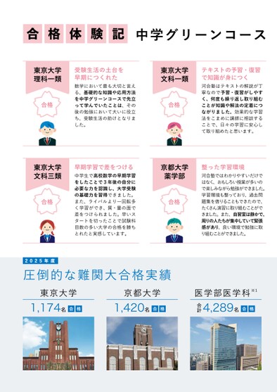圧倒的な難関大合格実績2025年度1,174名東京大学合格1,420名京都大学合格医学部医学科※14,289名合格合計合格体験記中学グリーンコース受験生活の土台を早期につくれた数学において最も大切と言える、基礎的な知識や応用方法を中学グリーンコースで先立って学んでいたことは、その後の勉強において大いに役立ち、受験生活の助けとなりました。テキストの予習・復習で知識が身につく河合塾はテキストの解説が丁寧なので予習・復習がしやすく、何度も繰り返し取り組むことが知識や解法の定着につながりました。効果的な学習法をこまめに講師に相談することで、日々の学習に安心して取り組めたと思います。早期学習で差をつける中学生で高校数学の早期学習をしたことで3年後の自分に必要な力を認識し、大学受験の基礎力を習得できました。また、ライバルより一回転多く学習ができ、質・量の面で差をつけられました。早いスタートを切ったことで試験科目数の多い大学の合格を勝ちとれたと実感しています。整った学習環境河合塾ではわかりやすいだけではなく、おもしろい授業が多いので楽しみながら勉強ができました。学習環境も整っており、過去問題集を借りることもできたので、たくさん演習に取り組むことができました。また、自習室は静かで、周りの人たちが集中していて緊張感があり、良い環境で勉強に取り組むことができました。京都大学薬学部合格東京大学文科三類合格東京大学文科一類合格東京大学理科一類合格
