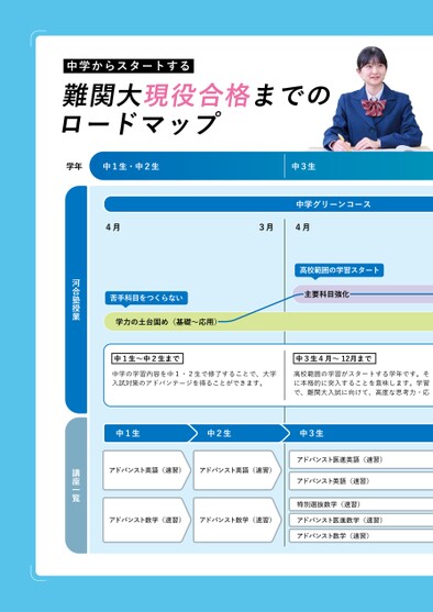 難関大現役合格までのロードマップ中学からスタートする学年中1生・中2生4月4月3月中3生河合塾授業講座一覧学力の土台固め(基礎〜応用)主要科目強化高校範囲の学習スタート苦手科目をつくらない中1生〜中2生まで中学の学習内容を中1・2生で修了することで、大学入試対策のアドバンテージを得ることができます。中3生4月〜12月まで高校範囲の学習がスタートする学年です。そに本格的に突入することを意味します。学習で、難関大入試に向けて、高度な思考力・応中3生中2生中1生アドバンスト英語(速習)アドバンスト医進英語(速習)アドバンスト英語(速習)アドバンスト数学(速習)アドバンスト英語(速習)アドバンスト数学(速習)特別選抜数学(速習)アドバンスト医進数学(速習)アドバンスト数学(速習)中学グリーンコース