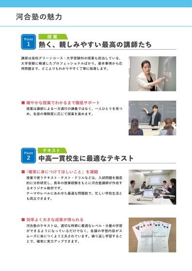 河合塾の魅力Point1授業熱く、親しみやすい最高の講師たち講師は高校グリーンコース・大学受験科の授業も担当している、大学受験に精通したプロフェッショナルばかり。基本事項から応用問題まで、どこよりもわかりやすく丁寧に指導します。■細やかな授業でわかるまで徹底サポート授業は講師による一方通行の講義ではなく、一人ひとりを見つめ、生徒の理解度に応じて授業を進めます。Point2テキスト中高一貫校生に最適なテキスト■「確実に身につけてほしいこと」を凝縮授業で使うテキスト・テスト・ドリルなどは、入試問題を徹底的に分析研究し、長年の授業経験をもとに河合塾講師が作成するオリジナル教材です。テーマやレベルにあわせた最適な問題数で、忙しい学校生活とも両立できます。■効率よく大きな成果が得られる河合塾のテキストは、適切な時期に最適なレベル・分量の学習ができるようになっているだけでなく、各講の学習内容がスムーズに身につくよう工夫されています。繰り返し学習することで、確実に実力アップできます。