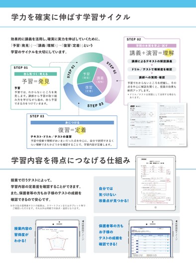 学力を確実に伸ばす学習サイクル効果的に講義を活用し、確実に実力を伸ばしていくために、STEP02「予習(発見)」→「講義(理解)」→「復習(定着)」という学習のサイクルを大切にしています。STEP01自ら気づく・考える予習=発見予習予習では、わからないところを発見します。講師から予習の取り組み方を学びながら進め、自ら予習できる力をつけていきます。STEP03講義(理解)予習(発見)復習(定着)学問の本質を学ぶ・試す講義+演習=理解講師によるテキストの解説講義ドリル/テストで理解度を確認講師への質問・確認予習でわからないところを把握し、その点を中心に解説を聞くと、授業の効果も断然アップします。*ドリル/テストは宿題として活用する場合もあります。身につける復習=定着テキスト・ドリル/テストの復習予習や授業で理解があいまいだった点を中心に、自分で説明できるくらい理解できたかどうかを確認することで、学習内容が定着します。学習内容を得点につなげる仕組み授業で行うテストによって、学習内容の定着度を確認することができます。また、保護者等の方もお子様のテストの成績を確認できるので安心です。※中3生の習得度テストの結果は、スマートフォンまたはタブレット等でご確認いただけます。それ以外は用紙での採点・返却となります。自分では気づけない改善点が見つかる!▲成績画面イメージ931831.2.7保護者等の方もお子様のテストの成績を確認できる!▲成績画面イメージ授業内容の習得度がわかる!