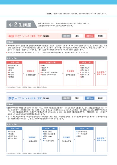 [認定制]…受講には認定(受講資格)が必要です。認定の取得方法は17ページをご確認ください。中2生講座中高一貫校の方にとって、中学の勉強を完成させなければならない学年です。高校範囲の学習に向けて万全の基礎固めをします。英語中2アドバンスト英語(速習)[認定制]授業時間90分設置校舎麹町校授業内容大学受験において必要とされる総合的な英語力(語彙力・文法力・読解力)を高めるカリキュラムで授業を行います。まずは「文法」を項目順に先取り学習し、それを抽象度の高い英文でさえも読み解くことのできる「真の読解力」の構築へと繋げます。また、「読む・書く・聞く・話す」という語学4技能のひとつである、「書く」力も早い時期から伸ばすよう工夫した教材を使用します。授業内で復習用ドリルに取り組むことによって、その日の授業内容の理解度を、その場で確認することができます。カリキュラム1学期〈11講〉●時制のまとめ●助動詞●文型●不定詞●動名詞●接続詞2学期〈12講〉●比較●現在完了●受動態●不定詞を含む重要表現●名詞節と時制の一致夏期講習1学期の復習3学期〈7講〉●分詞●関係代名詞●語のまとめ●句のまとめ●節のまとめ●読解冬期講習2学期の復習春期講習/新中3生へ※カリキュラムは予定です。※講習は、別途お申し込み・受講料が必要です。数学中2アドバンスト数学(速習)[認定制]授業時間90分設置校舎麹町校授業内容難関大学の数学の問題を解くプロセスにおいては、判断力や洞察力が必要です。与えられた条件を整理して、正しい結論を導き出すには、「何を、どの方法で、どの順番に使っていけば良いのか」を考えなくてはなりません(もちろん方法は一つとは限りません)。難関大学入試において、この「数学的な思考力」の差が大きな得点力の差となります。さらに、ここで養う「数学的な思考力」「問題解決力」は、その後の人生にとっても大切な能力だと河合塾は考えています。中1・2生講座では中学3年分の学習内容を2年間で扱います。皆さんの理解度を確認しながら授業を進めて行きますが、必ず事前に予習をして授業に臨んでください。また、授業内で復習用ドリルにも取り組みます。カリキュラム1学期〈11講〉●式の計算●平方根●2次方程式●図形と相似2学期〈12講〉●図形と相似●線分の比と計量●関数y=ax²●円●三平方の定理冬期講習2学期の復習3学期〈7講〉●三平方の定理●データの活用●確率夏期講習1学期の復習春期講習/新中3生へ※カリキュラムは予定です。※講習は、別途お申し込み・受講料が必要です。
