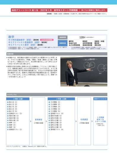 高校グリーンコース高1生2027年1月新学年スタート学期開講秋ごろに詳細をご案内します。[認定制]…受講には認定(受講資格)が必要です。認定の取得方法は17ページをご確認ください。数学中3特別選抜数学(速習)[認定制]中3アドバンスト医進数学(速習)[認定制]中3アドバンスト数学(速習)[認定制]2026年度新規開講授業時間設置校舎120分※途中休憩あり麹町校自由が丘校あざみ野現役館新宿校吉祥寺現役館南浦和現役館池袋校(本館)横浜校津田沼校※「特別選抜数学(速習)」、「アドバンスト医進数学(速習)」、「アドバンスト数学(速習)」は、同じカリキュラム・教材です。※「特別選抜数学(速習)」は、より発展的な問題を扱います。中3特別選抜数学(速習)は横浜校にのみ設置しています。中3アドバンスト医進数学(速習)は麹町校にのみ設置しています。授業内容本講座では、高校講座の基礎である数学ⅠAの範囲を中心に学習します。テキストは基本的に「例題」「練習」「発展(講座により扱いが異なります)」で構成されており、各分野の基本をしっかり押さえながら来るべき大学入試に備えます。授業の内容を確実に習得させるため講義後に「ドリル」に取り組むことで、理解度を確認しながら学習を進めることができます。さらに各分野の学習終了後や各学期の最終講では、それまでの学習内容の習得度を確認するため、授業中に問題を解き解説講義を受ける「習得度テスト」があります。これらに年間を通して取り組むことで、受験への一歩を先取りしましょう!2学期〈13講〉高校グリーンコース冬期講習2学期の復習1月開講新高1生スタート学期※詳細は別途ご案内します。2次関数(1)2次関数(2)2次関数(3)2次関数(4)2次関数(5)習得度テスト(3)図形の性質(1)図形の性質(2)図形と計量(1)図形と計量(2)図形と計量(3)図形と計量(4)習得度テスト(4)❶❷❸❹❺❻❼❽❾❿⓫⓬⓭夏期講習1学期の復習カリキュラム1学期〈13講〉数と式(1)数と式(2)数と式(3)数と式(4)数と式(5)習得度テスト(1)場合の数(1)場合の数(2)場合の数(3)確率(1)確率(2)確率(3)習得度テスト(2)❶❷❸❹❺❻❼❽❾❿⓫⓬⓭※カリキュラムは予定です。※講習は、別途お申し込み・受講料が必要です。