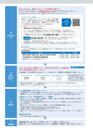 お申し込みには、事前にログインⅠDの登録が必要です。以下のいずれかの方法で、受講開始希望日の4日前までにお申し込みください。※学習効果を高めるための予習ができるよう、受講開始日7日前までのお申し込みをおすすめします。インターネット申込Webサイト「申込マイページ」にログイン後、「入塾(講座・コース)・講習・寮を申し込む」からご希望の講座をお申し込みください。申込完了後、ご登録のメールアドレス宛てに「申込受付完了のお知らせ」メールが届きます。※入塾金免除については、20ページをご覧ください。河合塾インターネット申込操作方法などのお問い合わせインターネット申込の操作方法は、Webサイトの「申込ご利用ガイド」をご確認ください。なお、ご不明な点は、河合塾カスタマーサポートセンターにお電話にてお問い合わせください。河合塾カスタマーサポートセンター0120-511-192※おかけ間違いにご注意ください。受付時間12:00〜19:30日曜・祝日および12/31〜1/3は受付を行いません。なお、3/20(金・祝)は受付いたします。※ⅠP電話など、一部ご利用になれない場合があります。※受付開始直後および終了間際の時間帯は、お問い合わせが集中し、つながりにくいことがあります。ご了承ください。※河合塾カスタマーサポートセンターでは、正確な応対と、対応品質向上のため、通話内容を録音させていただいております。窓口申込一人ひとりの学習状況に応じたご相談を承ります。その場でお申し込みいただけます。窓口受付時間校舎名麹町校・新宿校・池袋校(本館)・自由が丘校・横浜校・津田沼校吉祥寺現役館・あざみ野現役館・南浦和現役館※講習期間中など、上記と異なる期間もございます。月〜土日・祝11:00〜19:0014:00〜21:0010:00〜17:0010:00〜17:00お申し込み内容をご確認のうえ、ご指定の決済手段で、支払期限日までに初回学費をお支払いください。入金確認後、「申込手続完了のお知らせ」メールが届きます。学籍番号と所属校舎をご確認ください。詳細は19〜22ページへクレジットカードコンビニエンスストアPay-easyペイジー)※教材は入金確認後に配付しますので、お早めにお支払いください(3月下旬より送付または配付)。詳細は、21ページの「学費お支払い上の注意」をご覧ください。学費の決済手段登録完了には、保護者等の方のメールアドレスおよびログインⅠDの登録※が必要です。※保護者等の方のログインⅠDの事前登録は不要です。「入塾関係書類」などのダウンロード入金確認後、2月下旬から確認いただけます。申込マイページ内「各種ご案内ダウンロード」から「受講ガイドブック」などをダウンロードいただき、今後の流れについてご確認をお願いします。「塾生マイページ(塾生専用サイト)」の登録塾生マイページでは、「受講証(時間割)」の確認、校舎への入退館・授業の出席状況、校舎からのお知らせなどをご覧いただけます。また、初回ログイン後の画面に表示されるメールアドレスに「入退館メール」をお送りするサービスもあります。塾生マイページにログインのうえ、各種サービスのご利用準備をお願いします。「受講証(時間割)」は2026/4/1(水)以降に塾生マイページにて確認できます。※※「受講証(時間割)」では受講する講座の使用教材や注意事項をご確認いただけます。※塾生マイページへのログインは2月上旬から可能です。※塾生マイページへのログイン方法は、申込マイページ内「各種ご案内ダウンロード」に掲載の「受講ガイドブック」をご確認ください。教材の受け取り3月下旬から送付または配付いたします。年間授業日程(25・26ページ参照)に従って、授業にご出席ください。受講にあたってご不明な点等がありましたら、受講校舎・現役館へお問い合わせください。4入塾申込をする5学費の支払いをする6手続完了7受講開始