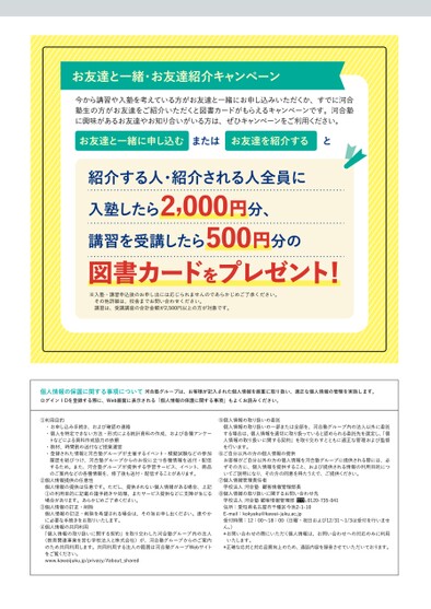 お友達と一緒・お友達紹介キャンペーン今から講習や入塾を考えている方がお友達と一緒にお申し込みいただくか、すでに河合塾生の方がお友達をご紹介いただくと図書カードがもらえるキャンペーンです。河合塾に興味があるお友達やお知り合いがいる方は、ぜひキャンペーンをご利用ください。お友達と一緒に申し込むまたはお友達を紹介すると紹介する人・紹介される人全員に入塾したら2,000円分、講習を受講したら500円分の図書カードをプレゼント!※入塾・講習申込後のお申し出には応じられませんのであらかじめご了承ください。その他詳細は、校舎までお問い合わせください。講習は、受講講座の合計金額が2,500円以上の方が対象です。個人情報の保護に関する事項について河合塾グループは、お客様が記入された個人情報を厳重に取り扱い、適正な個人情報の管理を実施します。ログインⅠDを登録する際に、Web画面に表示される「個人情報の保護に関する事項」もよくお読みください。①利用目的・お申し込み手続き、および確認の連絡・個人を特定できない方法・形式による統計資料の作成、および各種アンケートなどによる資料作成協力の依頼・教材、時間割の送付など授業運営・登録された情報と河合塾グループが主催するイベント・模擬試験などの参加履歴を結びつけ、河合塾グループからのお役に立つ各種情報を送付・配信するため。また、河合塾グループが提供する学習サービス、イベント、商品のご案内などの各種情報を、修了後も送付・配信することがあります。②個人情報提供の任意性個人情報の提供は任意です。ただし、提供されない個人情報がある場合、上記①の利用目的に記載の諸手続きや処理、またサービス提供などに支障が生じる場合があります。あらかじめご了承ください。③個人情報の訂正・削除個人情報の訂正・削除を希望される場合は、その旨お申し出ください。速やかに必要な手続きをお取りいたします。④個人情報の共同利用「個人情報の取り扱いに関する契約」を取り交わした河合塾グループ内の法人(教育関連事業を営む学校法人と株式会社)が、河合塾グループからのご案内のため共同利用します。共同利用する法人の範囲は河合塾グループWebサイトをご覧ください。www.kawaijuku.jp/privacy/#about_shared⑤個人情報の取り扱いの委託個人情報の取り扱いの一部または全部を、河合塾グループ内の法人以外に委託する場合は、個人情報を適切に取り扱っていると認められる委託先を選定し、「個人情報の取り扱いに関する契約」を取り交わすとともに適正な管理および監督を行います。⑥ご自分以外の方の個人情報の提供お客様がご自分以外の方の個人情報を河合塾グループに提供される際には、必ずその方に、個人情報を提供すること、および提供される情報の利用目的についてご説明になり、その方の同意を得たうえで、ご提供ください。⑦個人情報管理責任者学校法人河合塾顧客情報管理部長⑧個人情報の取り扱いに関するお問い合わせ先学校法人河合塾顧客情報管理部0120-735-041住所:愛知県名古屋市千種区今池2-1-10E-mail:kokyaku@kawai-juku.ac.jp受付時間:12:00〜18:00(日曜・祝日および12/31〜1/3は受付を行いませ®ん。)*お問い合わせの際にいただく個人情報は、お問い合わせへの対応のみに利用いたします。*正確な応対と対応品質向上のため、通話内容を録音させていただいております。
