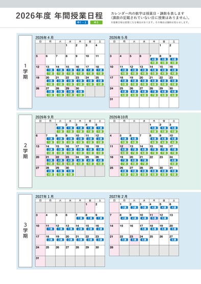 1学期2学期3学期カレンダー内の数字は授業日・講数を表します(講数の記載されていない日に授業はありません)。※授業日程は変更になる場合があります。その場合は随時お知らせします。2026年度年間授業日程日月火水木金土4講4講3講3講3講3講4講4講4講4講4講4講5講5講4講4講4講4講5講5講5講5講5講5講6講6講5講5講5講5講6講6講6講6講6講6講7講7講6講6講6講6講12345678910111213141516171819202122232425262728293031日月火水木金土5講5講5講5講5講5講5講5講6講6講6講6講6講6講6講6講6講6講7講7講6講6講7講7講7講7講7講7講7講7講8講8講7講7講8講8講8講8講9講9講8講8講8講8講8講8講9講9講12345678910111213141516171819202122232425262728293031日月火水木金土3講3講3講4講4講4講4講4講4講5講5講5講6講6講5講5講5講6講6講12345678910111213141516171819202122232425262728日月火水木金土1講1講1講1講1講1講1講1講1講1講1講1講2講2講2講2講2講2講2講2講2講2講2講2講3講3講3講3講3講3講3講3講日月火水木金土1講1講1講1講1講1講1講1講1講1講1講1講2講2講2講2講2講2講2講2講2講2講2講2講3講3講3講3講3講3講3講3講3講3講3講3講4講4講4講4講4講4講4講4講4講4講4講4講5講5講5講5講1234567891011121314151617181920212223242526272829302026年4月2026年9月2027年1月2026年5月2026年10月2027年2月日月火水木金土1講1講1講1講1講1講2講2講2講2講2講2講3講3講3講12345678910111213141516171819202122232425262728293031123456789101112131415161718192021222324252627282930中1・2中3
