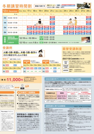 河合塾中学グリーンコース 福岡校 冬期講習のデジタルカタログ。講座案内や申込方法、授業料(受講料)、スケジュール、時間割など、冬期・直前講習(冬季・直前講習)に関する情報をお届けします。大学受験の予備校、学校法人河合塾の公式サイトをご利用ください。