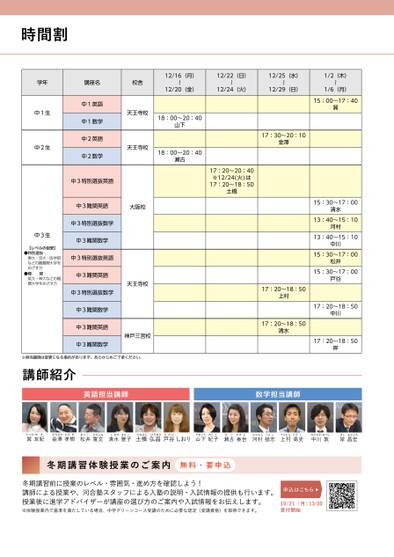 時間割学年講座名校舎12/16(月)~12/20(金)12/22(日)~12/24(火)12/25(水)~12/29(日)1/2(木)~1/6(月)中1生中2生中3生【レベルの目安】●特別選抜:東大・京大・医学部などの最難関大学をめざす方●難関:阪大・神大などの難関大学をめざす方17:20~20:40※12/24(火)は17:20~18:50土橋中1英語中1数学中2英語中2数学天王寺校天王寺校18:00~20:40山下18:00~20:40瀬古中3特別選抜英語中3難関英語大阪校中3特別選抜数学中3難関数学中3特別選抜英語中3難関英語中3特別選抜数学中3難関数学中3難関英語中3難関数学天王寺校神戸三宮校15:00~17:40巽17:30~20:10金澤15:30~17:00清水13:40~15:10河村13:40~15:10中川15:30~17:00松井15:30~17:00戸谷17:20~18:50中川17:20~18:50岸17:20~18:50上村17:20~18:50清水※担当講師は変更になる場合があります。あらかじめご了承ください。講師紹介英語担当講師数学担当講師たつみゆき巽友紀かなざわたかき金澤孝樹まついひろふみ松井寛文しみずまさこ清水雅子つちはしひろまさ土橋弘昌とたに戸谷しおりやましたのりこ山下紀子せこやすよ瀬古泰世かわむらつよし河村強志うえむらたかし上村高史なかがわあつし中川敦きしまさひろ岸昌宏冬期講習体験授業のご案内無料・要申込冬期講習前に授業のレベル・雰囲気・進め方を確認しよう!講師による授業や、河合塾スタッフによる入塾の説明・入試情報の提供も行います。授業後に進学アドバイザーが講座の選び方のご案内や入試情報をお伝えします。※体験授業内で基準を満たしている場合、中学グリーンコース受講のために必要な認定(受講資格)を取得できます。申込はこちら▲10/21(月)13:00受付開始