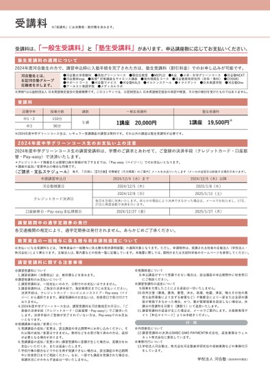 受講料※「受講料」には消費税・教材費を含みます。受講料は、「一般生受講料」と「塾生受講料」があります。申込講座数に応じてお支払いください。塾生受講料の適用について2024年度河合塾生の方で、講習申込時に入塾手続を完了された方は、塾生受講料(割引料金)でのお申し込みが可能です。河合塾生とは、右記河合塾グループ在籍者を示します。●河合塾大学受験科●高校グリーンコース●現役生教室●MEPLO●K会●小学・中学グリーンコース●河合塾NEXT●河合塾Winɡs●英検対策講座&サイエンス講座●海外帰国生コース●河合塾美術研究所(本科・専科)●COSMO●サポートコース●河合塾マナビス●河合塾KALS●ドルトンスクール●トライデント●日米英語学院●河合塾One●アーネスト英語学院●メディカルラボ※英検®は公益財団法人日本英語検定協会の登録商標です。このコンテンツは、公営財団法人日本英語検定協会の承認や推奨、その他の検討を受けたものではありません。受講料設置学年中1・2中3授業分数150分90分講数5講一般生受講料塾生受講料1講座20,000円1講座19,500円※※2024年度中学グリーンコース生は、レギュラー受講講座の講習は無料です。それ以外の講座は塾生受講料が必要です。2024年度中学グリーンコース生のお支払い上の注意2024年度中学グリーンコース生の講習受講料は、学費のご請求とあわせて、ご登録の決済手段(クレジットカード・口座振替・Pay-easy)で決済いたします。*クレジットカード情報または振替口座の登録が完了するまでは、「Pay-easy(ペイジー)」でのお支払いとなります。*講座の追加/変更申込の場合も同様です。〈ご請求・支払スケジュール〉毎月、7日頃に[【河合塾】学費確定(月次精算)のご案内]メールをお送りいたします(メールの送信日は前後する場合があります)。冬期講習申込日河合塾精算日クレジットカード決済日2024/12/4(水)まで2024/12/5(木)2024/12/8(日)2024/12/5(木)以降2025/1/8(水)2025/1/11(土)毎月8日頃に決済いたします。何らかの理由により決済できなかった場合は、メールでお知らせし、17日、27日に再度自動で決済を行います。口座振替日・Pay-easy支払期限日2024/12/27(金)2025/1/27(月)講習期間中の通学定期券の発行各交通機関の規定により、通学定期券は発行されません。あらかじめご了承ください。教育資金の一括贈与に係る贈与税非課税措置についてお支払いになる受講料などは、「教育資金の一括贈与に係る贈与税非課税措置」の適用対象となります。ただし、非課税枠は、受講される校舎の主催法人(学校法人・株式会社)により異なります。主催法人は、案内書などの校舎一覧に記載しています。本措置に関しては、国税庁または文部科学省のホームページを参照してください。講習受講料に関する注意事項1.●講習受講料について講習受講料(消費税込)は、教材費などを含みます。●講習受講料のお支払いについて講習受講料は、一括支払いのみで、分割でのお支払いはできません。講習受講料は、ご指定の決済手段で、指定期限日までにお支払いください。2.3.決済手段は、クレジットカード・コンビニエンスストア・Pay-easy(ペイジー)から選択できます。講習受講料のお支払いは、校舎窓口で受け付けておりません。4.2024年度中学グリーンコース生は、講習受講料を河合塾指定の月日に、「ご登録の決済手段(クレジットカード・口座振替・Pay-easy)」でご請求いたします。決済手段のご登録が完了されていない方は、Pay-easyでのお支払いとなります。5.●受講講座の追加/変更について受講講座の追加/変更は、該当講座の申込期間中にお申し込みください。それ以降の追加/変更はできません。教材などをお受け取り済みの方は、返却が必要となる場合があります。受講講座の追加/変更に伴い講習受講料に差額が生じた場合は、差額分をお6.支払いいただくか、または返金いたします。11.12.●受講辞退について8.申込講座がすべて受講できない場合は、該当講座の申込期間中に校舎窓口にご相談ください。●講習受講料の返金について9.授業を欠席したことによる返金は一切いたしません。10.自然災害(暴風、豪雨、豪雪、洪水、高潮、地震、津波、噴火その他の異常な自然現象により生ずる被害など)や塾都合により一部または全部の講習が実施できなかった場合、かつ、塾が振替授業を設定しない場合は、休講分の受講料を日割り(講割り)にて返金いたします。講習受講料の返金が生じた場合は、メールでご案内します。お客様専用サイト[申込マイページ]よりお手続きください。付則●外部委託について講習受講料の決済はSMBCGMOPAYMENT株式会社、返金業務はウェルネット株式会社に委託しています。●事務代行について学校法人河合塾は、株式会社河合塾進学研究社の収納業務などの事務代行13.学校行事の都合などでやむを得ず受講できない場合は、該当講座の申込期間7.をしています。中に校舎窓口までご相談ください。なお、一部でも講座を受講された場合は、受講状況にかかわらず返金