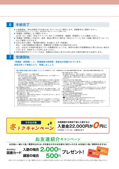 6手続完了入金確認後、「申込手続完了のお知らせ」をメールにてご案内します。受講番号をご確認ください。※2024年度中学グリーンコース生は、申込受付完了後にメールにてご案内します。「受講証(時間割)」をご確認ください。11/26(火)以降に「申込マイページ」内の「ご利用照会受講証(時間割)」にてご確認ください。「受講証(時間割)」の見方や、教材・配送に関するご案内を「申込マイページ」内の「各種ご案内ダウンロード」からご確認いただけます。申込・入金が受講直前の場合は、受講校舎での受取になる場合があります。また、お住まいの地域や配送センターの稼働状況によっては、教材のお届けが受講開始日に間に合わない場合もございます。余裕をもってお申し込みください。2024年度中学グリーンコース生は、受講料のお支払い前でも12月上旬から教材を配付または送付します。12月上旬から順次、「事前配付教材」をお届けします(宅配便)。7受講開始「受講証(時間割)」に、受講講座の時間割・教室名が記載されています。余裕を持って教室に入り、受講しましょう。「個人情報の保護に関する事項」について河合塾グループは、お客様が記入された個人情報を厳重に取り扱い、適正な個人情報の管理を実施します。①利用目的・お申し込み手続き、および確認の連絡・個人を特定できない方法・形式による統計資料の作成、および各種アンケートなどによる資料作成協力の依頼・教材、時間割の送付など授業運営・学籍簿の作成や保護者会のご案内などの各種ご連絡ほかクラス運営(入塾の場合)なお、記入された「カナ氏名」「生年月日」などの項目を利用して、河合塾グループが主催する講習、模擬試験、イベントなどへのご参加の履歴情報と結びつけ、進学や進路選定、および学校生活にお役に立つ情報の提供をはじめとする河合塾グループからの各種ご案内をさせていただくこともございます。②個人情報提供の任意性個人情報の提供は任意です。ただし、提供されない個人情報がある場合、上記①の利用目的に記載の諸手続きや処理、またサービス提供などに支障が生じる場合があります。あらかじめご了承ください。③個人情報の訂正・削除個人情報の訂正・削除を希望される場合は、その旨お申し出ください。速やかに必要な手続きをお取りいたします。④個人情報の共同利用「個人情報の取り扱いに関する契約」を取り交わした河合塾グループ内の法人(教育関連事業を営む学校法人と株式会社)が、河合塾グループからのご案内のため共同利用します。共同利用する法人の範囲は河合塾グループWebサイトをご覧ください。www.kawaijuku.jp/privacy/#about_shared⑤個人情報の取り扱いの委託個人情報の取り扱いの一部または全部を、河合塾グループ内の法人以外に委託する場合は、個人情報を適切に取り扱っていると認められる委託先を選定し、「個人情報の取り扱いに関する契約」を取り交わすとともに適正な管理および監督を行います。⑥ご自分以外の方の個人情報の提供お客様がご自分以外の方の個人情報を河合塾グループに提供される際には、必ずその方に、個人情報を提供すること、および提供される情報の利用目的についてご説明になり、その方の同意を得たうえで、ご提供ください。⑦中学生以下の方の個人情報の提供ご本人が満14歳未満の方、もしくは幼児から中学生までのサービスで、個人情報を河合塾グループに提供される際は、必ずその保護者等(法定代理人を含む)の方の同意のもとでご提供ください。⑧個人情報管理責任者学校法人河合塾顧客情報管理部長⑨個人情報の取り扱いに関するお問い合わせ先学校法人河合塾顧客情報管理部®0120-735-041E-mail:kokyaku@kawai-juku.ac.jp住所:愛知県名古屋市千種区今池2-1-10受付時間/12:00〜18:00(日曜・祝日および12/31〜1/3は受付を行いません。)*お問い合わせの際にいただく個人情報は、お問い合わせへの対応のみに利用いたします。*正確な応対と対応品質向上のため、通話内容を録音させていただいております。中学生対象冬期講習の手続完了後に入塾すると入塾金22,000円が円に0※2025/1/4(土)入塾申込までお友達紹介キャンペーンお友達と一緒に入塾/講習申込または、河合塾生の方がお友達をご紹介いただき、お友達が入塾/講習申込をするとそれぞれに図書カード入塾の場合講習の場合2,000円500円プレゼント!ご紹介いただいたお友達がすでに入塾/講習申込をされている場合はご利用になれません。また、兄弟・姉妹のご紹介にはご利用になれません。所定の用紙をご提出ください。